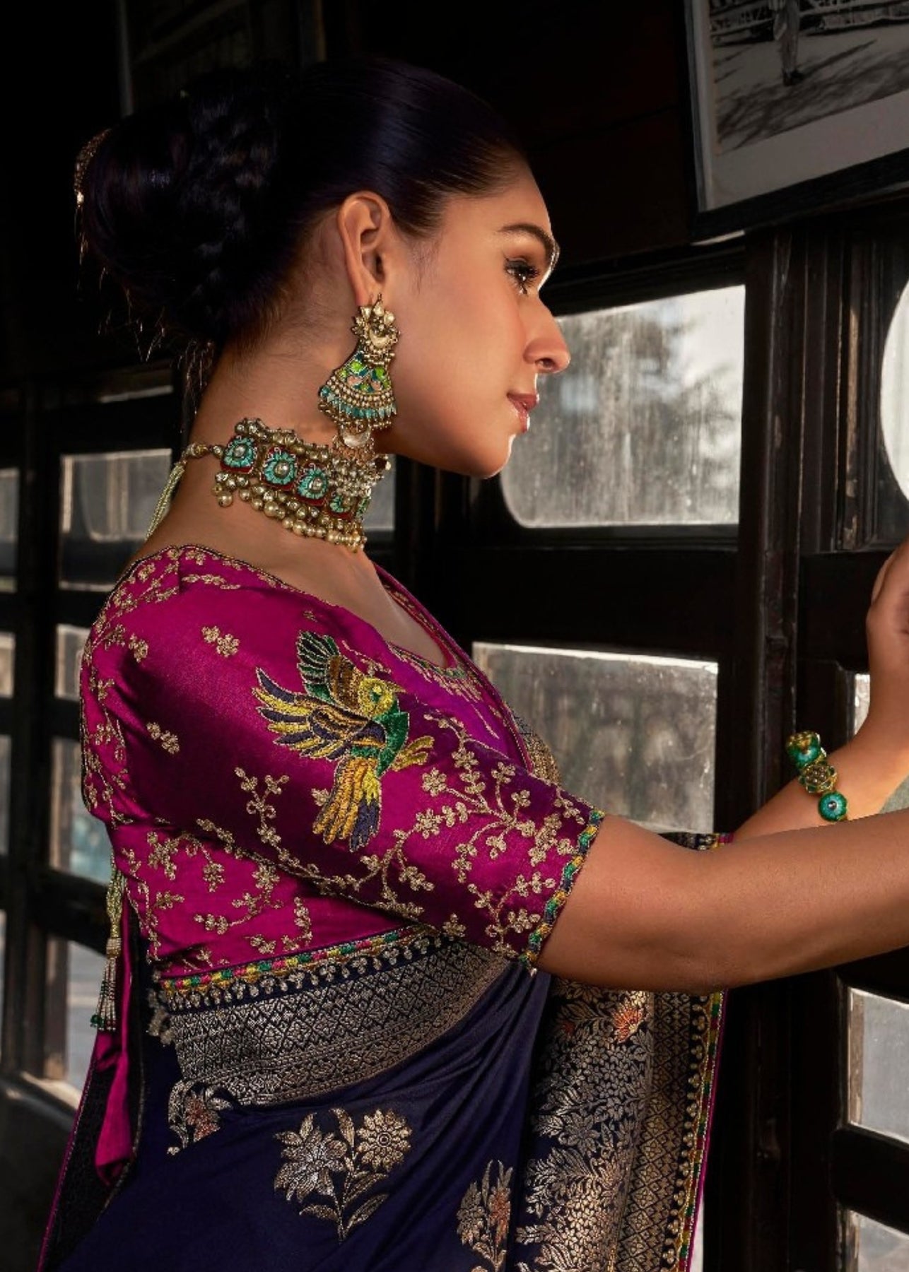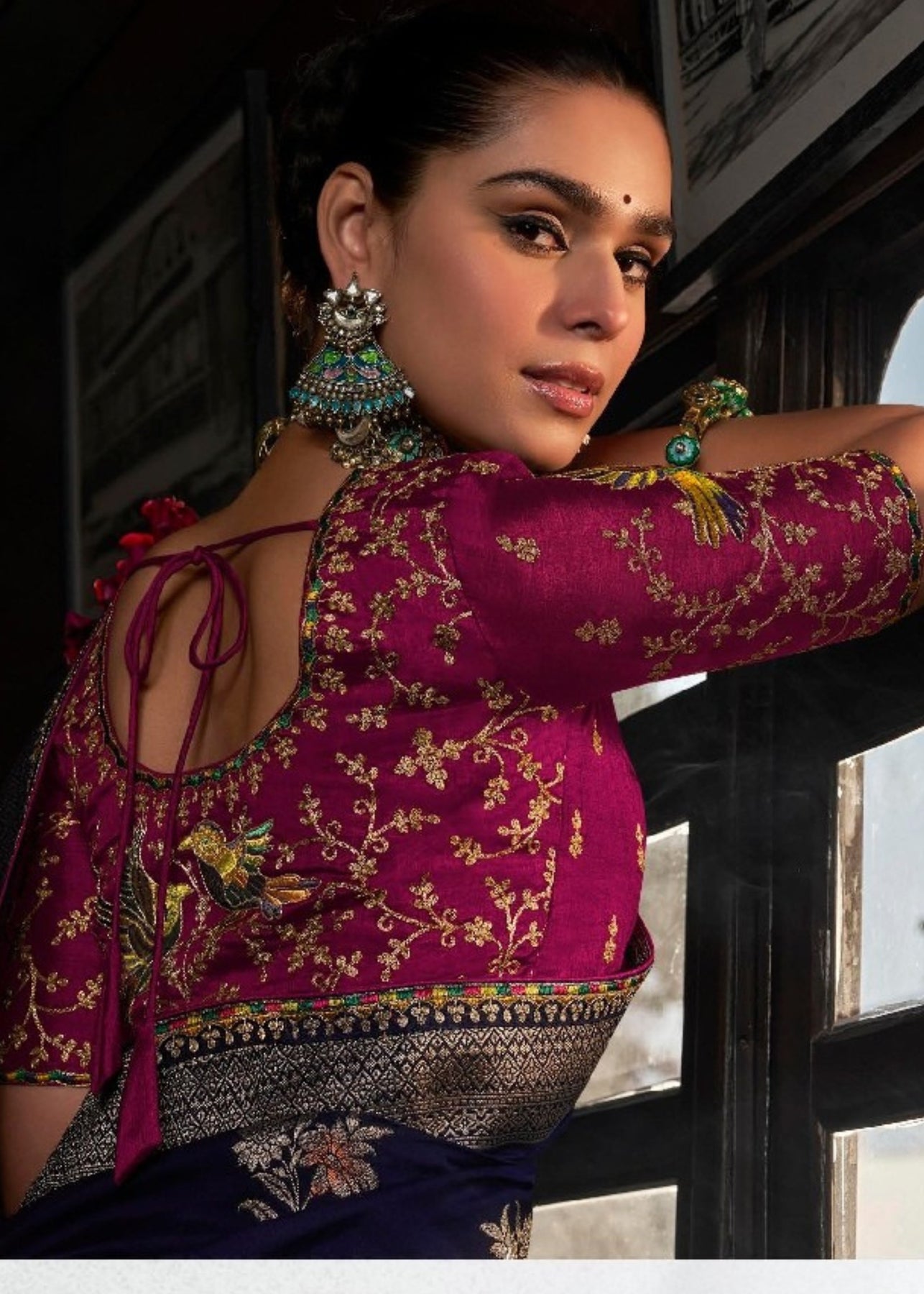 Navy Blue Soft Dola Viscous Silk with 3d Weaved Pallu and contrast blouse Saree