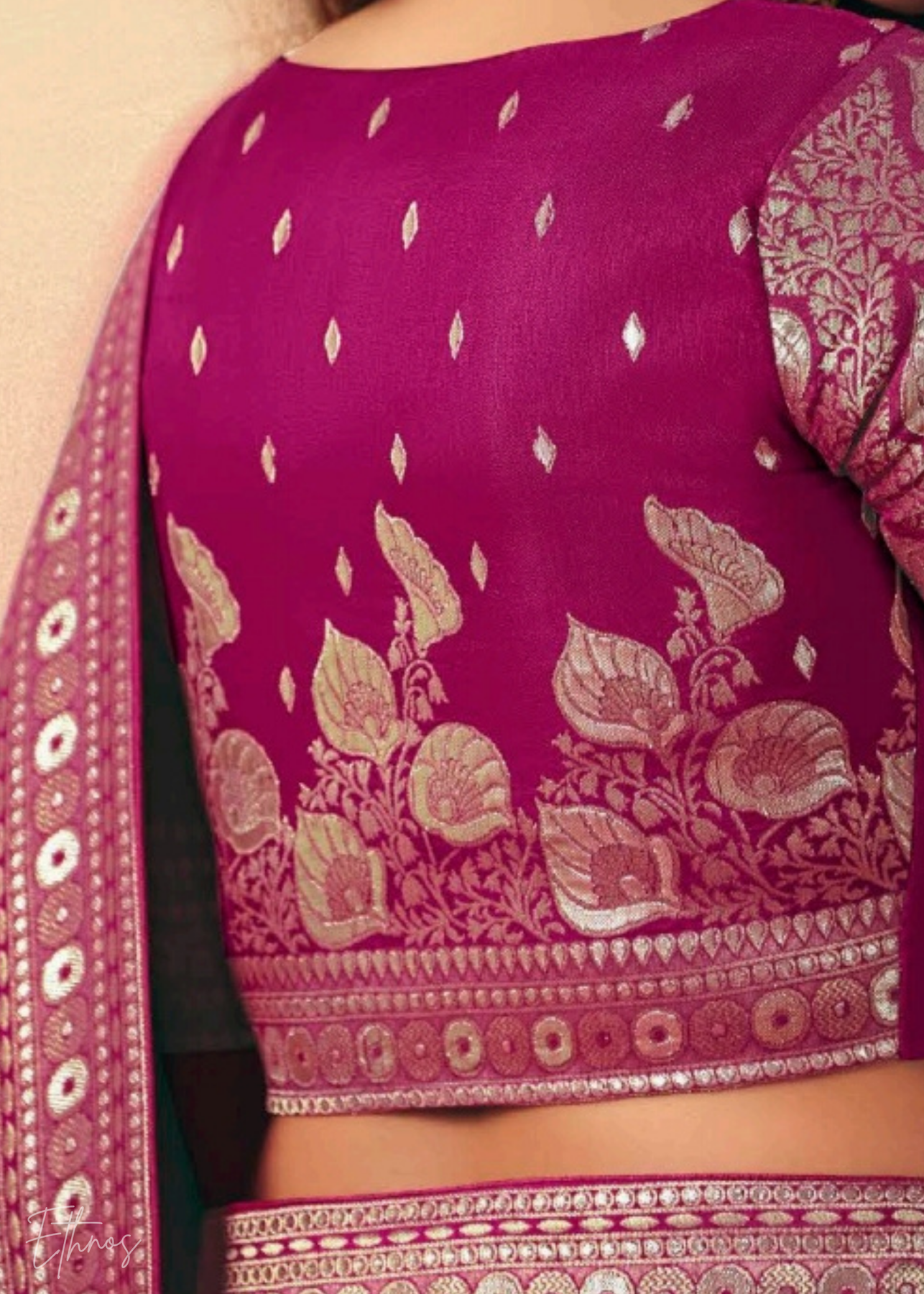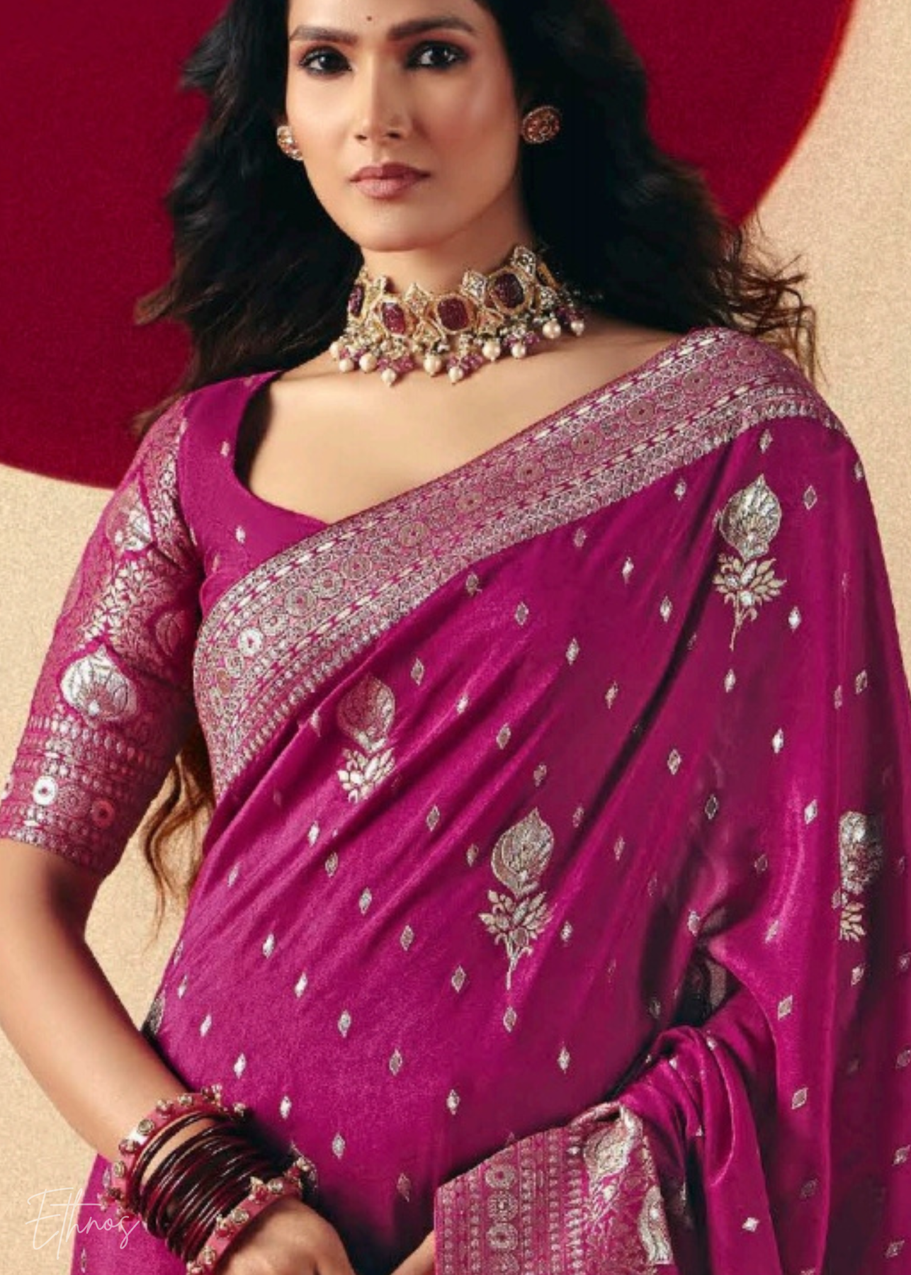 Drape yourself in pure viscous dola silk that's been dressed up with shimmering zari weaving and playful tassels for that extra flair. The matching brocade blouse gets its own golden touch with zari detailing, making this saree a show-stopping choice for celebrations and special moments.
