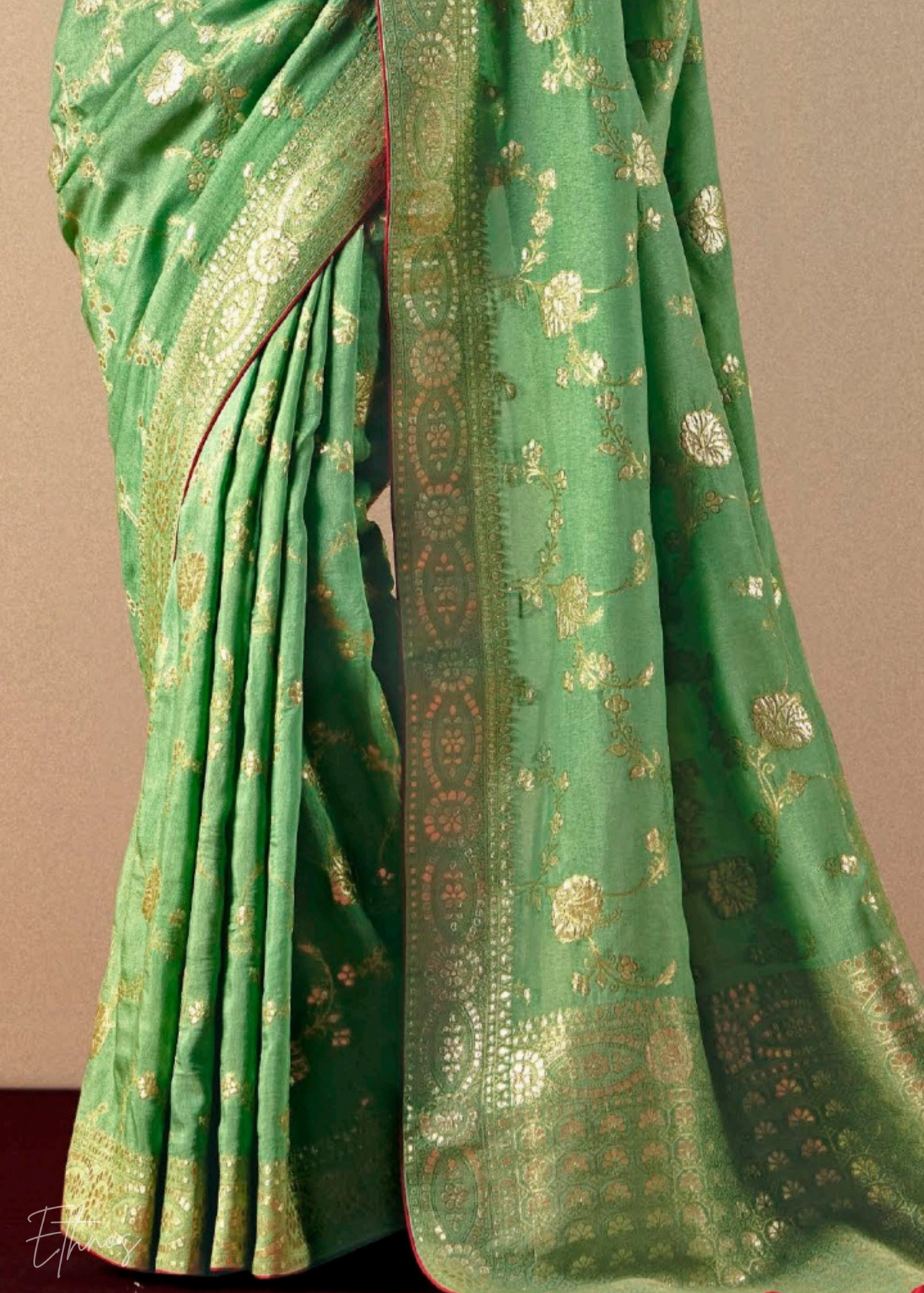 This exquisite saree showcases pure viscous dola silk as its foundation, elevated by intricate zari weaving and delicate tassel embellishments throughout. The coordinating blouse features luxurious brocade fabric adorned with complementary zari detailing, creating a cohesive and refined ensemble perfect for special occasions.