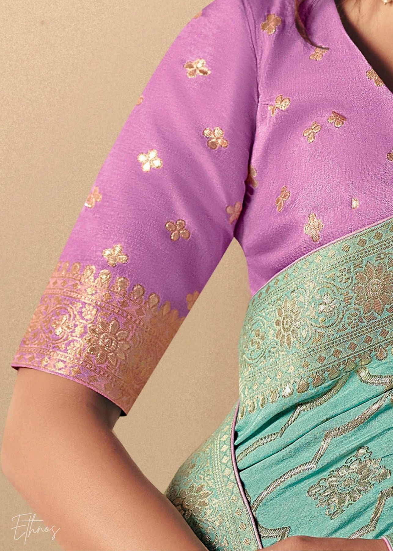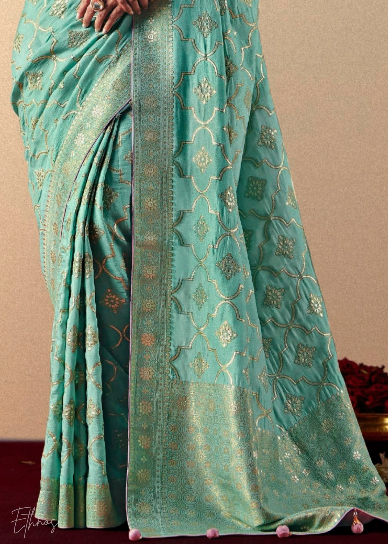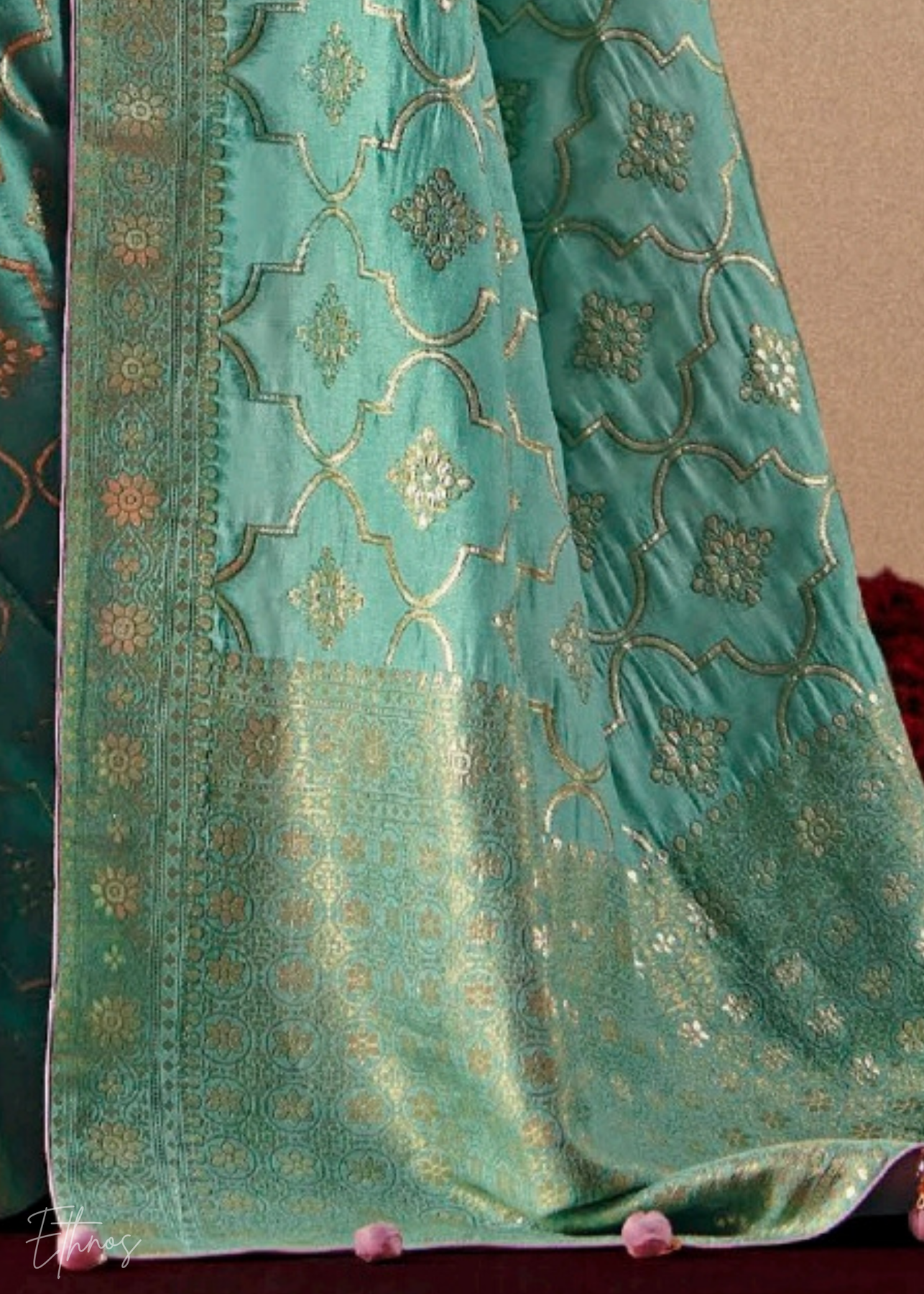 Drape yourself in luxe with this stunning powder blue saree crafted from sumptuous viscous dola silk. Golden zari threads dance across the fabric, adorned with charming tassels that add movement and flair. The matching brocade blouse features its own zari embellishments, making this ensemble a showstopper that's ready for any celebration.