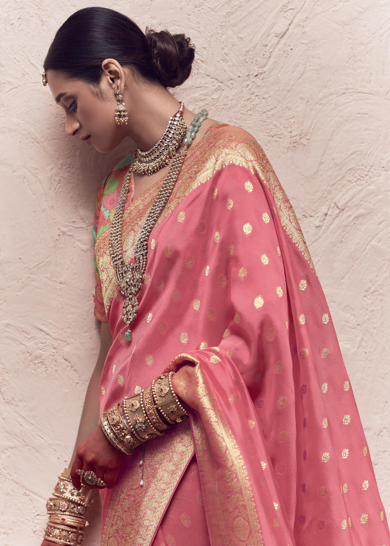 Watermelon Pink Zari Woven Dola Silk Saree, a masterpiece that blends luxurious texture with intricate craftsmanship.The saree features a watermelon pink shade, embodying a serene yet striking elegance. The dola silk fabric drapes beautifully, offering a soft, flowing silhouette that enhances your natural poise. Adorned with exquisite zari weaving, the saree showcases a shimmering, metallic pattern that adds a touch of regal charm and depth to the design.Whether you choose to pair it with statement jewelry for a bold, glamorous appearance or keep the accessories minimal for a more understated elegance, this ensemble ensures you radiate sophistication and style.