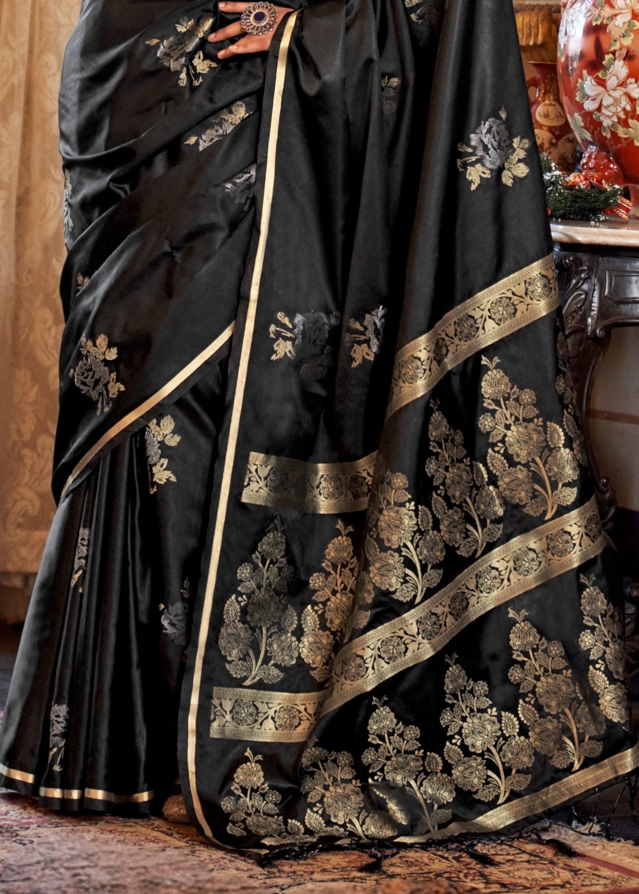 Step into the world of opulence with our Black Pure Satin Handloom Weaving Silk Saree — a masterpiece that seamlessly blends royal heritage with modern sophistication. Every thread whispers a story of skilled craftsmanship, rich tradition, and timeless beauty. Woven from pure satin silk, the fabric exudes an irresistible charm — soft as moonlight and fluid like poetry. Its glossy, high-sheen surface adds a touch of glamour, while the tightly woven handloom base ensures durability and strength. The rich black tone gives it a bold and commanding presence, making it perfect for women who embrace grace with power.