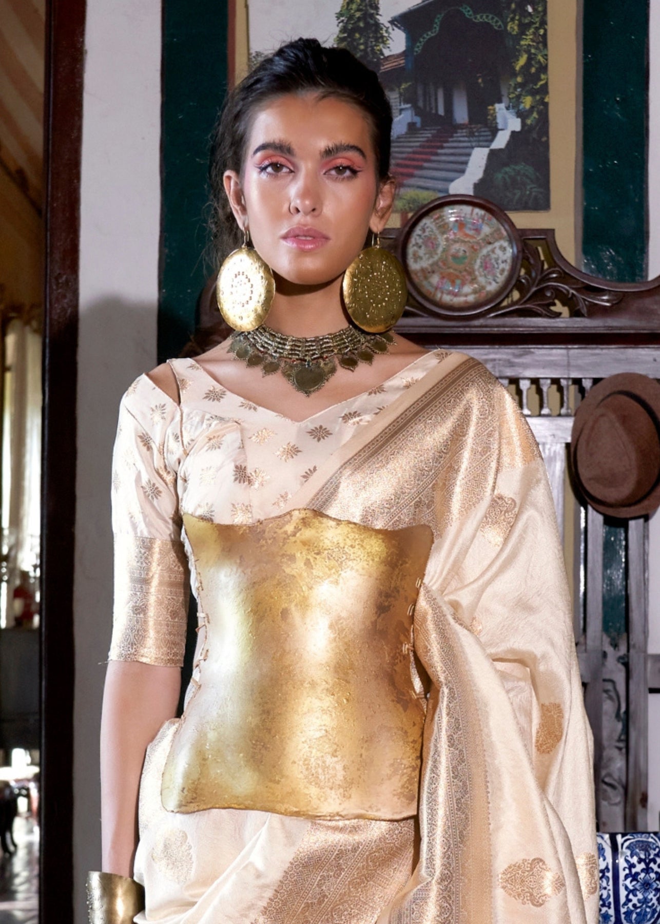 This Cream Two Tone Handloom Weaving Silk Saree is a celebration of quiet luxury and refined charm. With its serene cream base melting gently into a soft secondary tone, the saree reflects the grace of Indian handloom tradition while embracing a contemporary, minimalist aesthetic. Whether worn at festive gatherings, intimate weddings, or formal events, it commands attention with effortless poise.