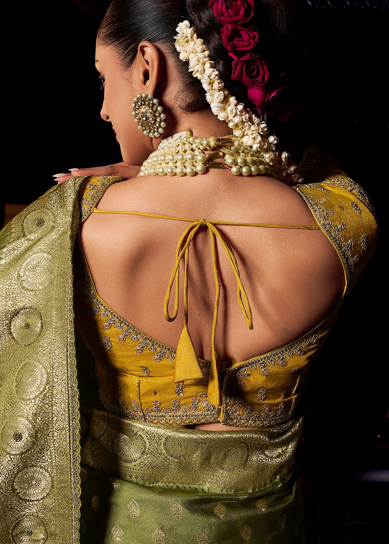 Green Viscose Tissue Silk Saree with Handworked Pallu And Contrast Designer Blouse