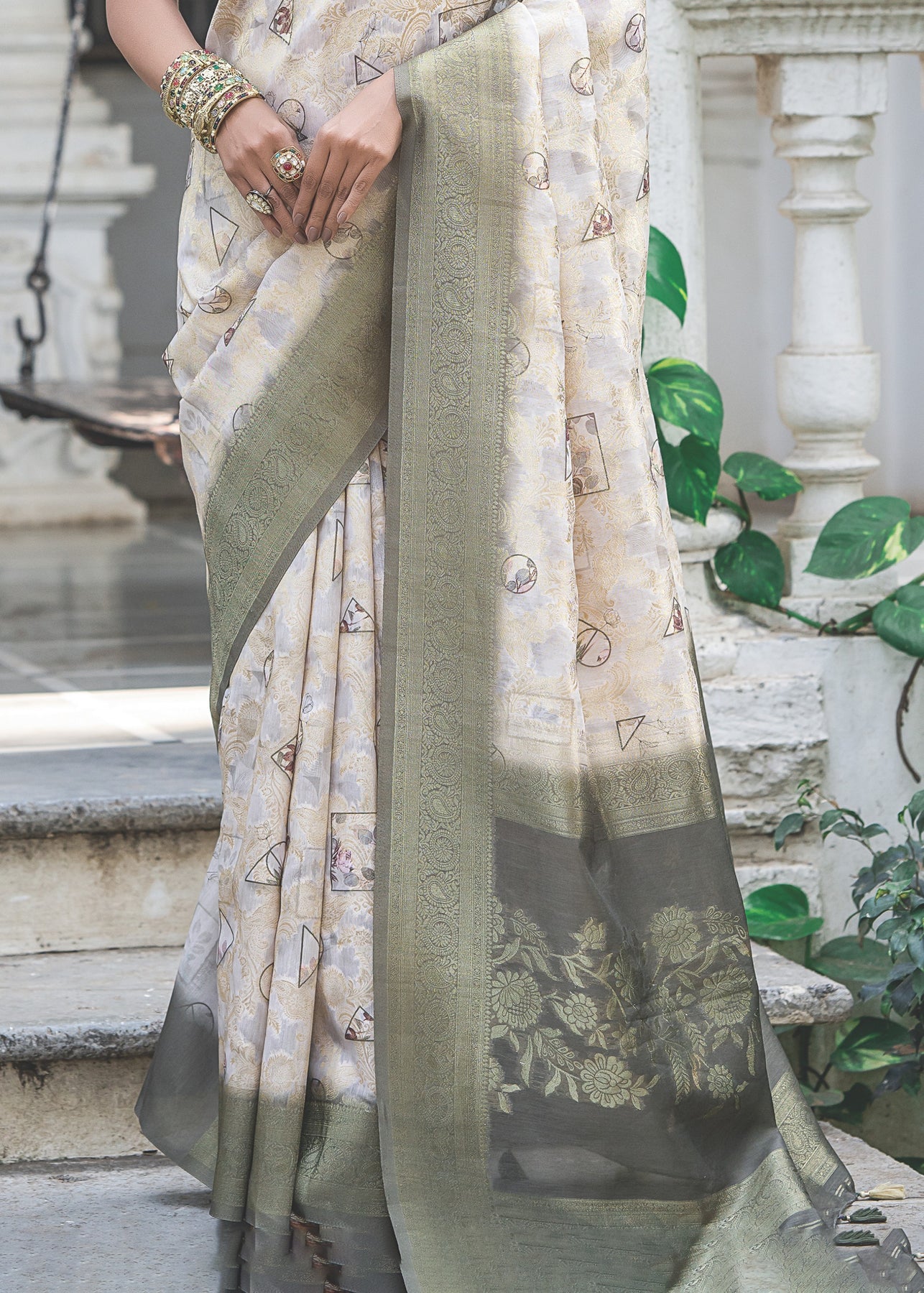 This elegant ivory-white woven silk saree features a luxurious, intricate design that combines tradition and grace. The contrast pallu adds a vibrant touch, enhancing its timeless appeal. Perfect for special occasions, it drapes beautifully for a sophisticated look. Elevate your style with this exquisite piece from Ethnos.