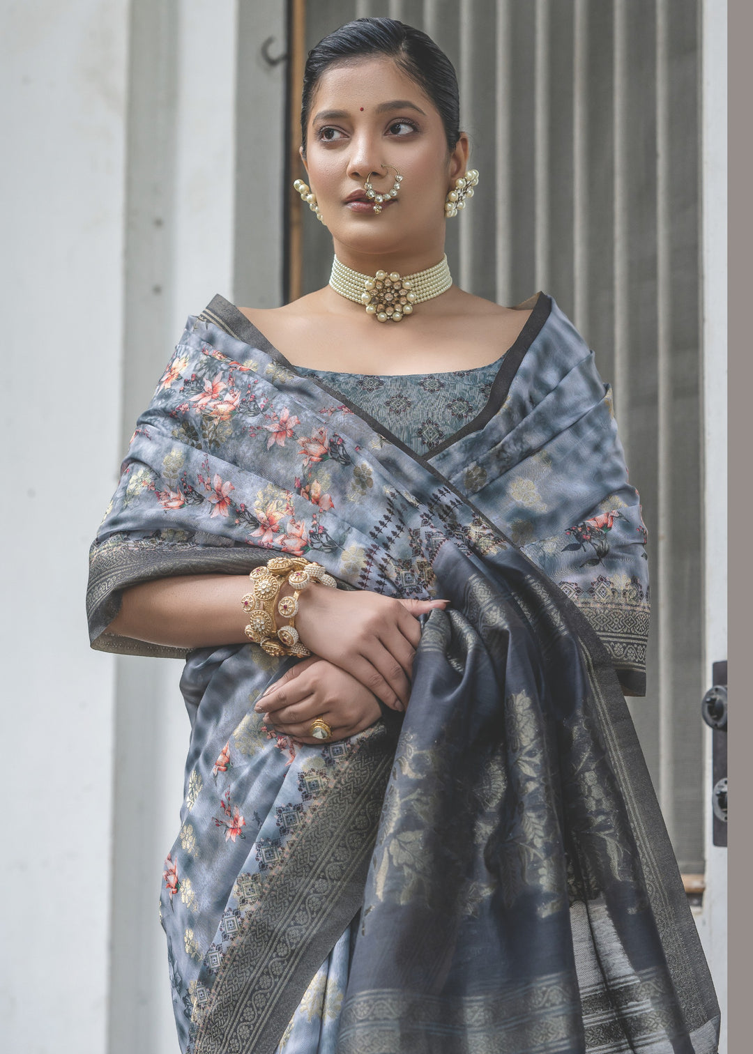 Astros Navy Blue Silk Saree With Luxury Print And Glory Finish