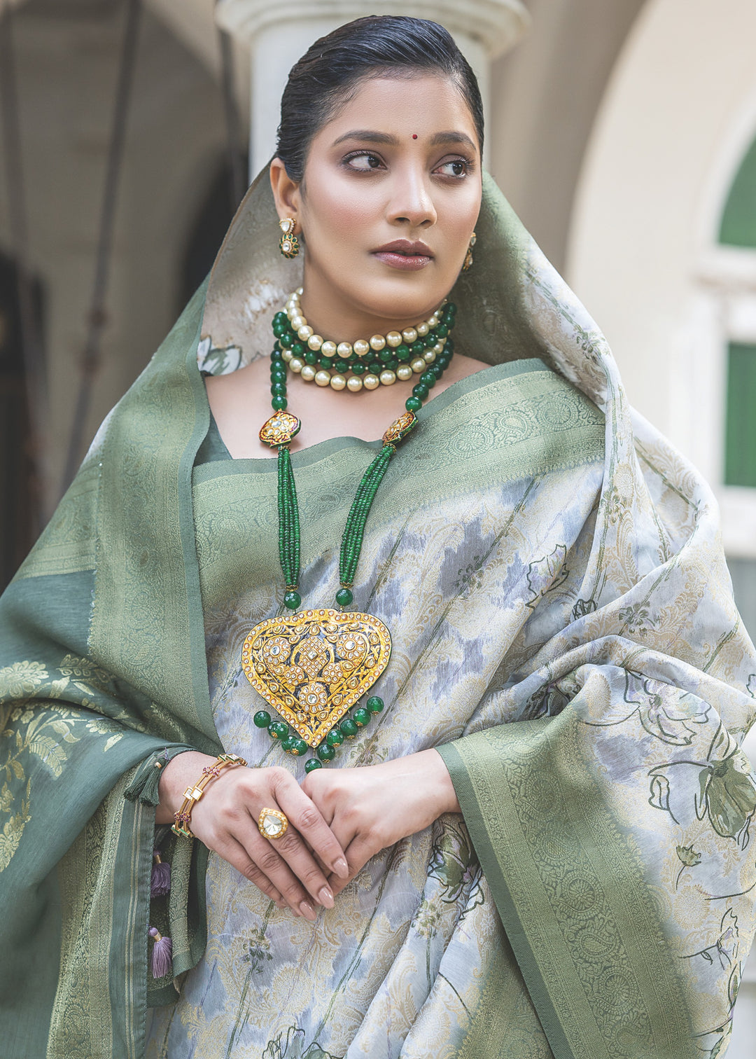 Tea Green Thread Woven Cotton Saree With Contrast Blouse And Pallu