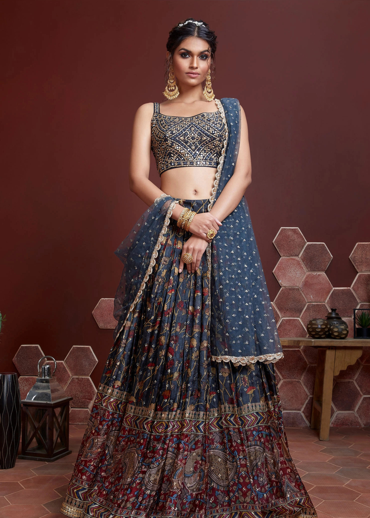 Dark Blue Floral Printed Chinon Silk Lehenga Choli with Sequins & Mirror work : Top Pick