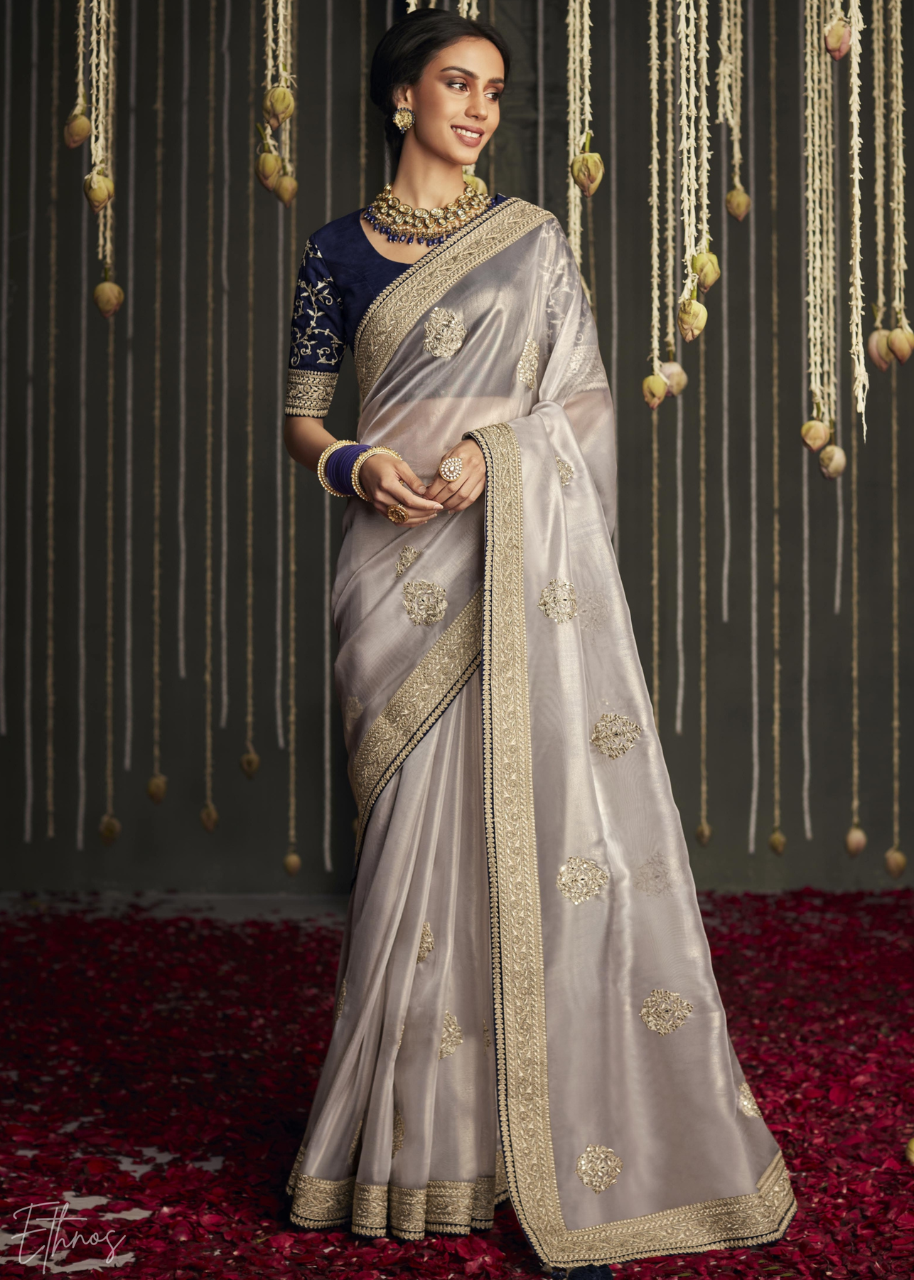 Grey Metallic Embroidered Organza Silk Saree : Top Pick