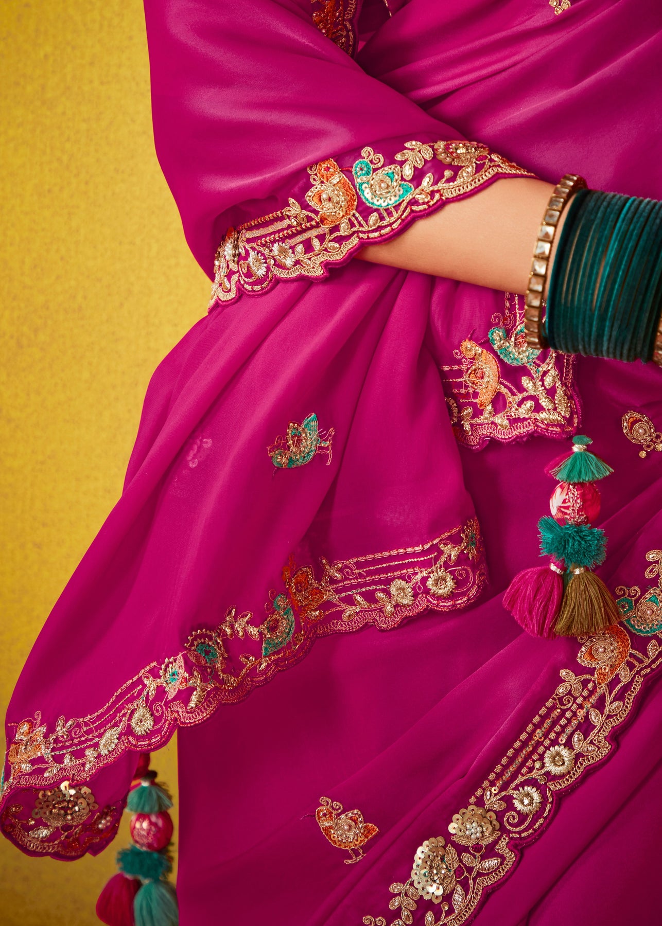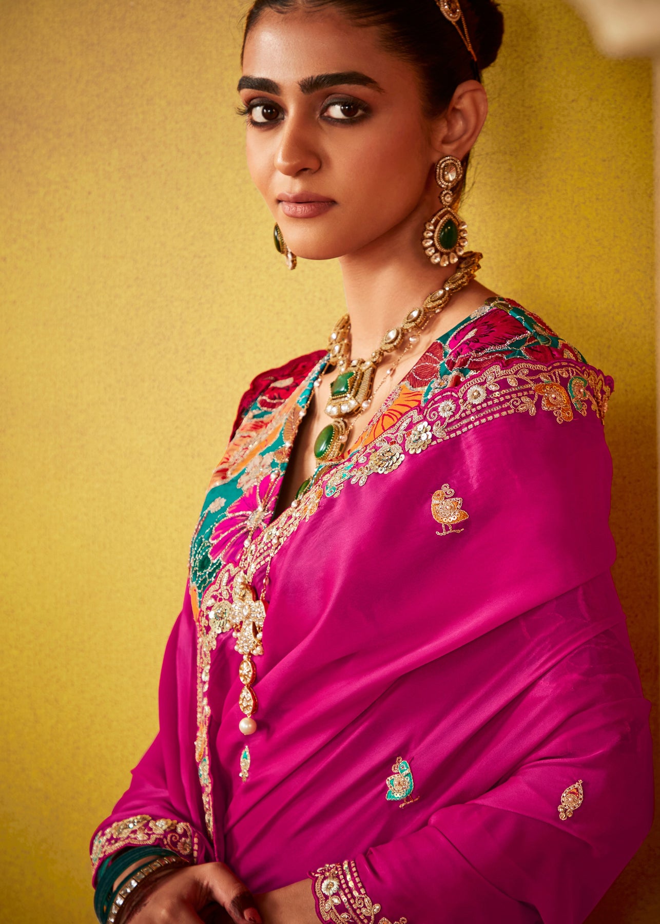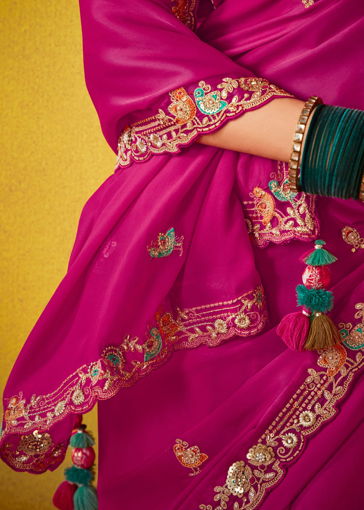 Barbie Pink Glass Tissue Silk Saree With Sequins And Thread Embroidered Work