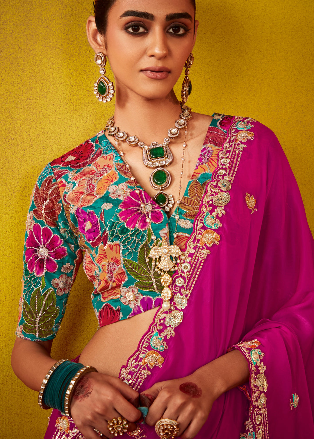 This Barbie Pink Glass Tissue Silk Saree features exquisite sequin and thread embroidery, creating a glamorous and intricate design. The delicate fabric gives it a shimmering, luxurious appeal, perfect for special occasions. The rich pink tone adds vibrancy and elegance, while the embroidered work enhances its visual charm. A stunning choice for anyone looking to stand out with a refined, traditional look.
