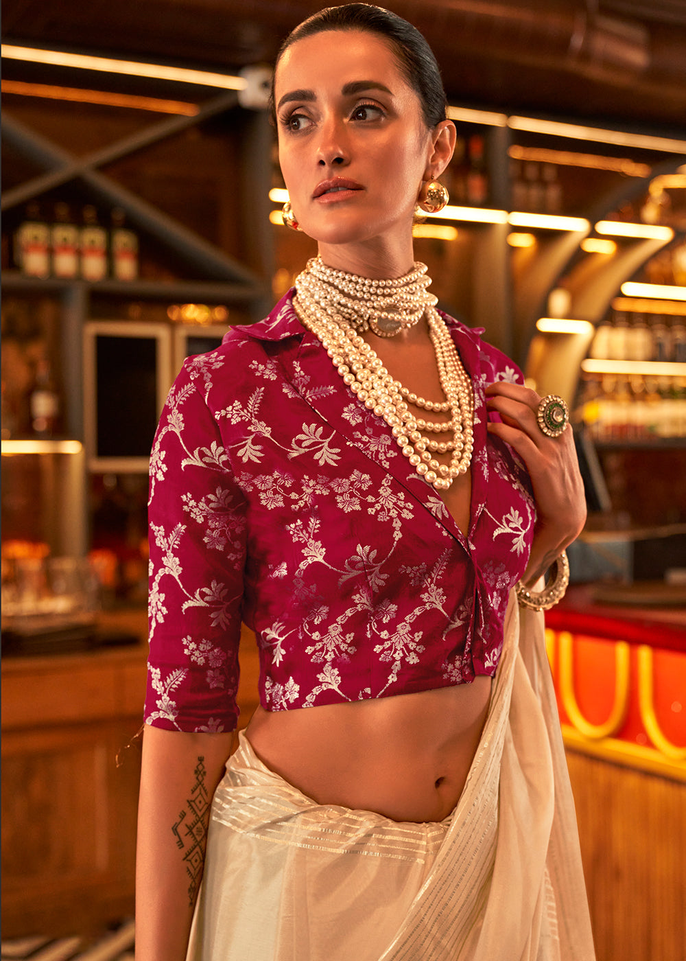 Beige Brown Handloom Woven Viscose Satin Saree with Contrast Blouse