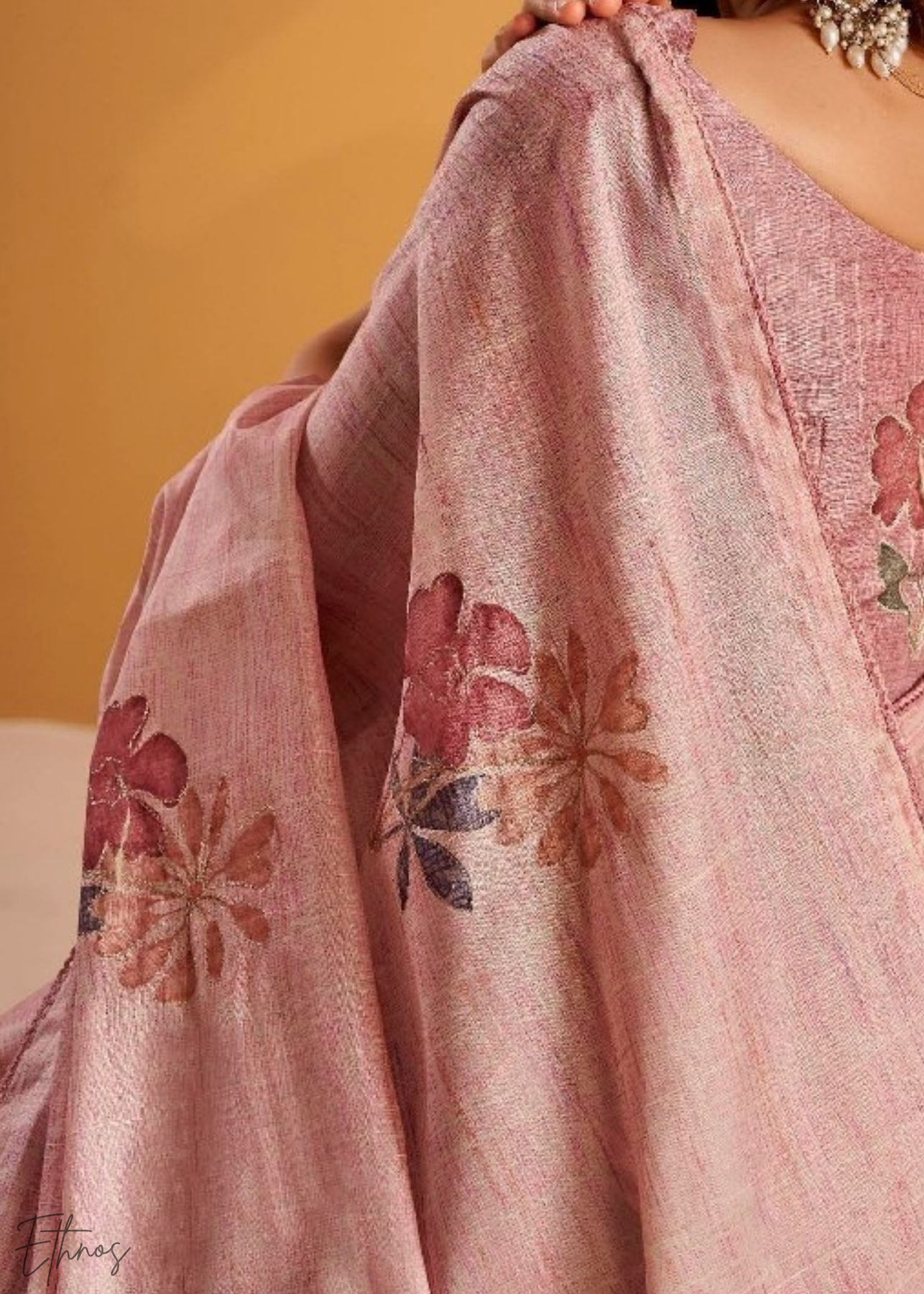 Blouse: Tusser art silk adorned with zari weaving and floral print.