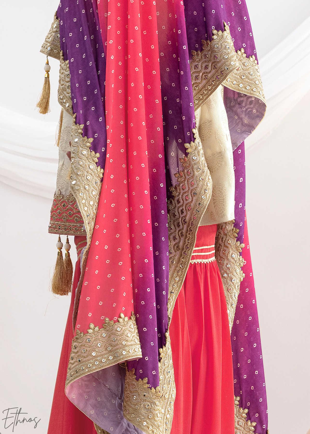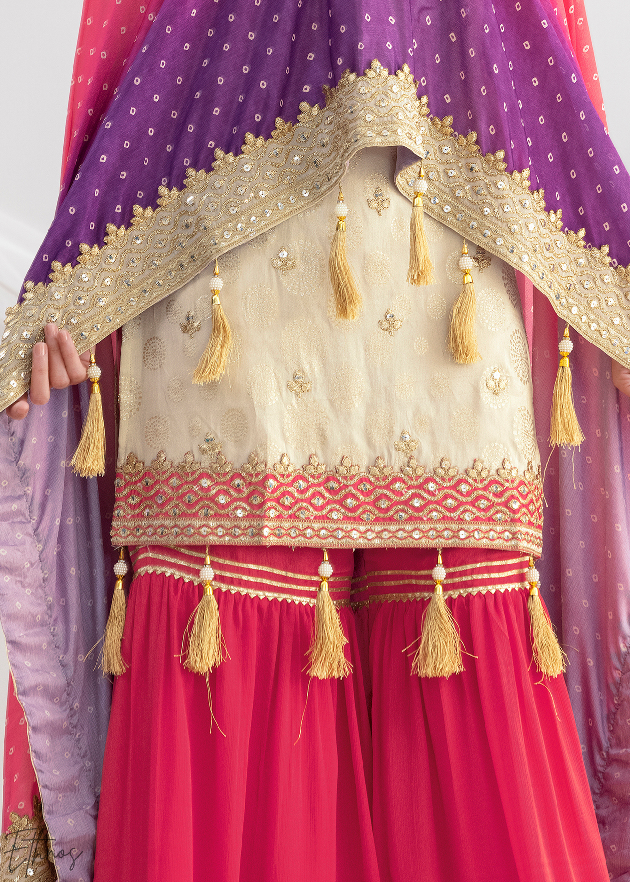 This stunning sharara suit is equal parts glamorous and fun! The top features a luxurious viscose simmer jaquard adorned with playful tassels and the sharara bottoms are embellished with intricate gota lace detailing. Complete the look with chinon dupatta, featuring a flattering v-neckline, vibrant digital print, and beautiful embroidery. Perfect for celebrations, weddings, or whenever you want to turn heads in beige and pink elegance