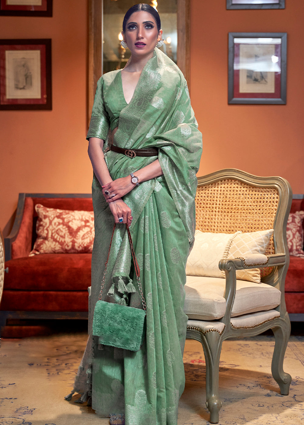 Spruce up your closet with this timeless poetic couture and grab compliments! A handcrafted perfection delicately crafted with delightful silken threads and a soothing texture, this Bermuda Green Woven Linen Silk Saree is a trendsetter to ace up your ethnic look. Embellished with a glittering appeal and tassels, this will make you rock every event.