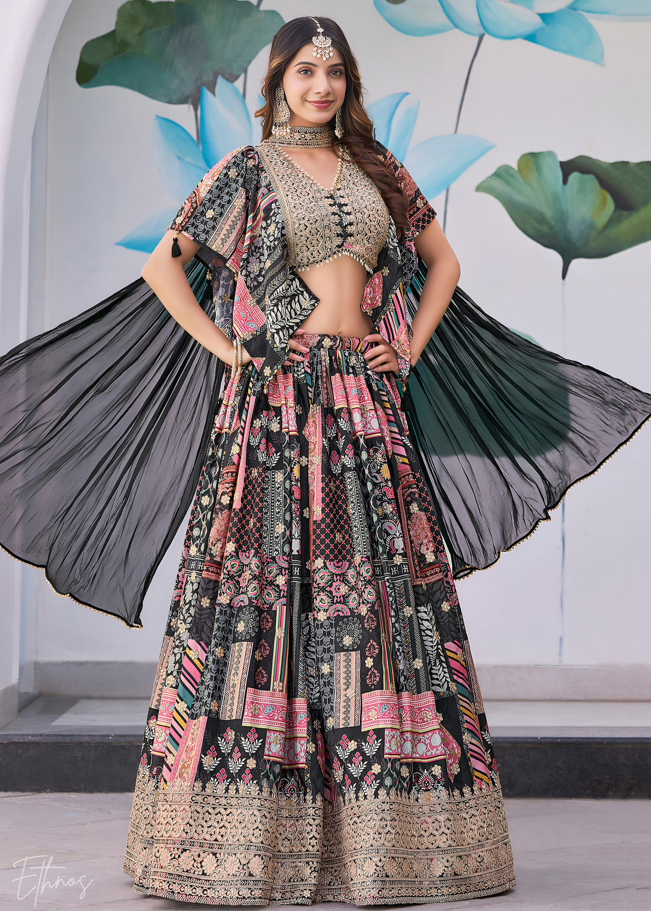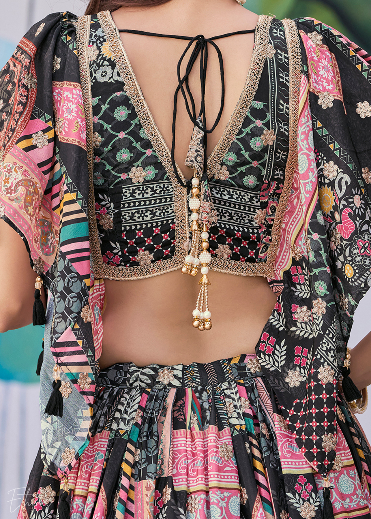 Command attention with black multi-color patchwork lehenga, a true masterpiece of modern ethnic design. The deep black canvas provides a stunning contrast to the vibrant, colorful panels and intricate dori scattered across the luxurious chinnon silk fabric. The sophisticated silhouette and stylish blouse offer a contemporary edge to traditional wear, making it an exquisite choice for cocktail parties.