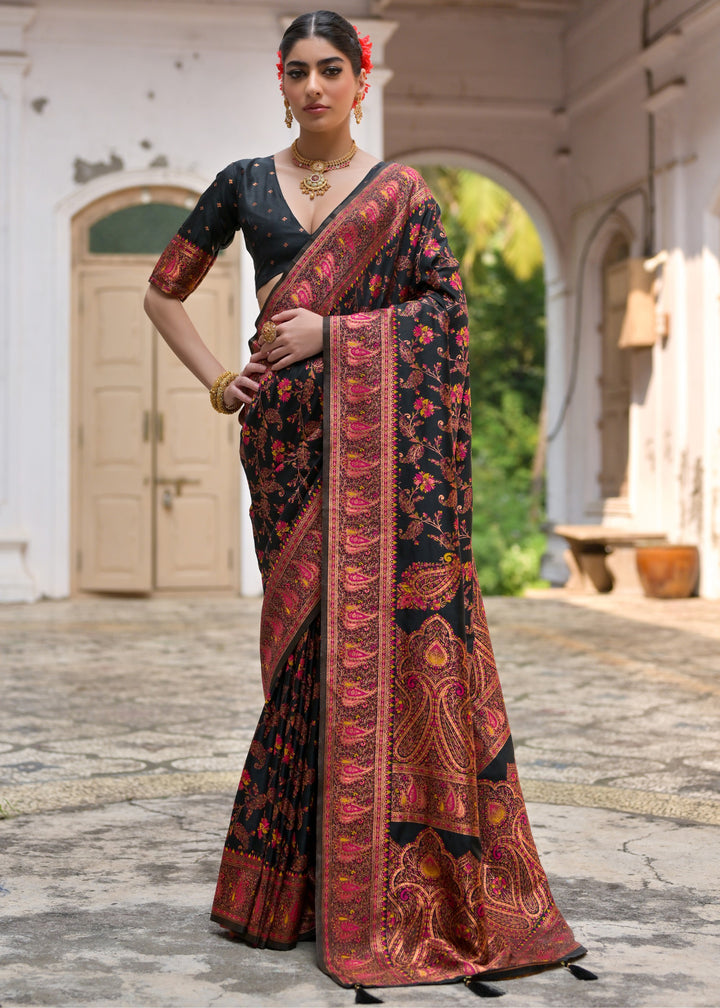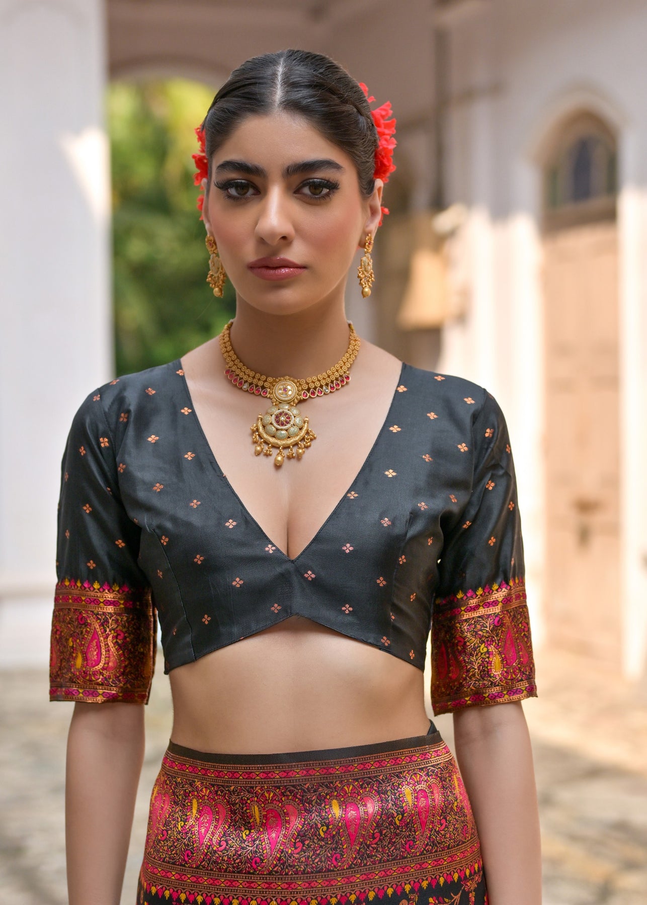 Elevate your ethnic wardrobe with this stunning Black Silk Saree, a masterpiece of intricate craftsmanship and timeless beauty. The saree features an exquisite thread-woven design, gracefully adorned with jal (netted) patterns and delicate floral motifs that flow seamlessly across the luxurious black silk base. The rich texture of the silk fabric adds a natural sheen, giving it a sophisticated and regal appeal.