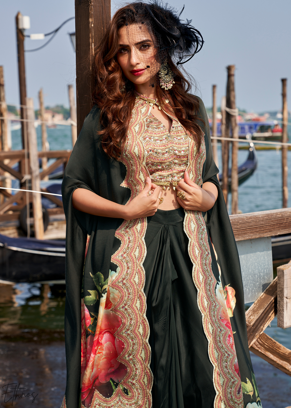 This sophisticated fusion set in premium black french crepe silk features a heavily embroidered bustier paired with modern draped dhoti-style bottoms. It is defined by a striking open-front long cape adorned with vibrant digital floral motifs and a scalloped embroidered border. This boho-luxe look is perfectly suited for grand evening events, such as cocktail parties, sangeets, or upscale festive celebrations.