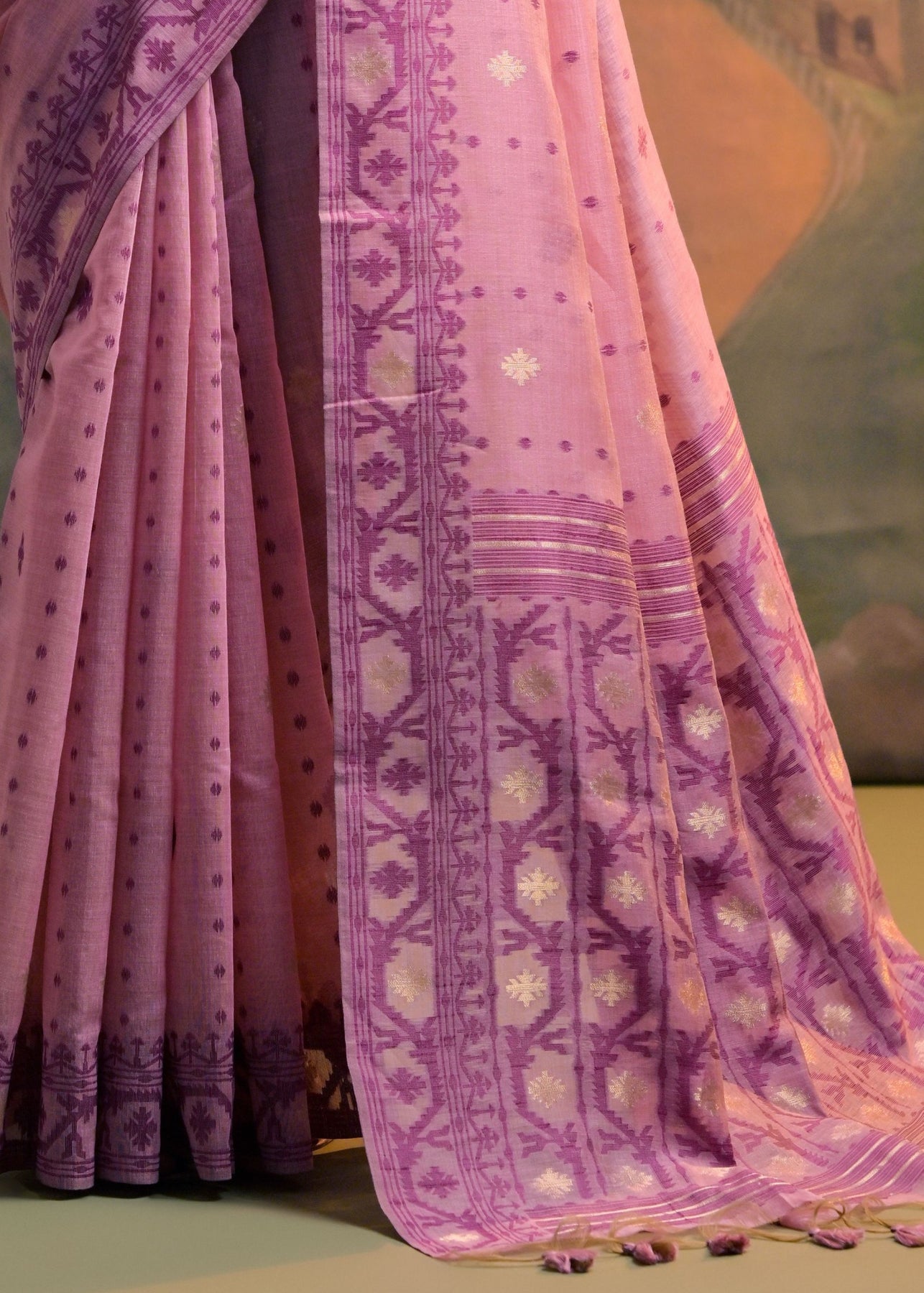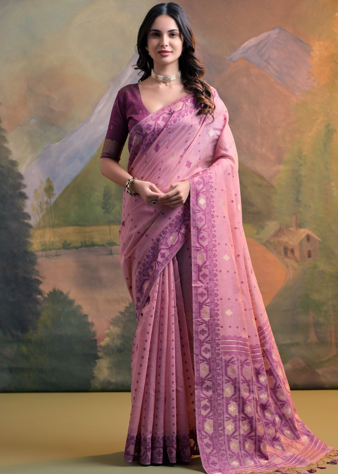 Blush Pink Thread Woven Cotton Saree With All Over Butti