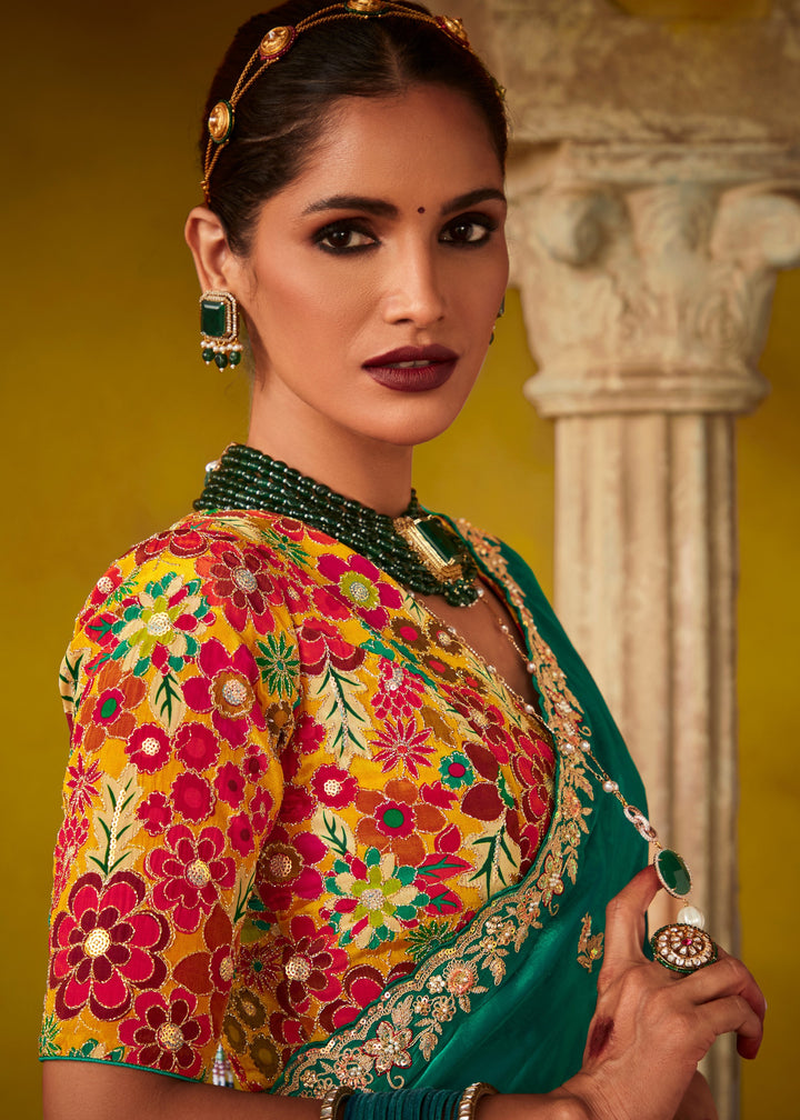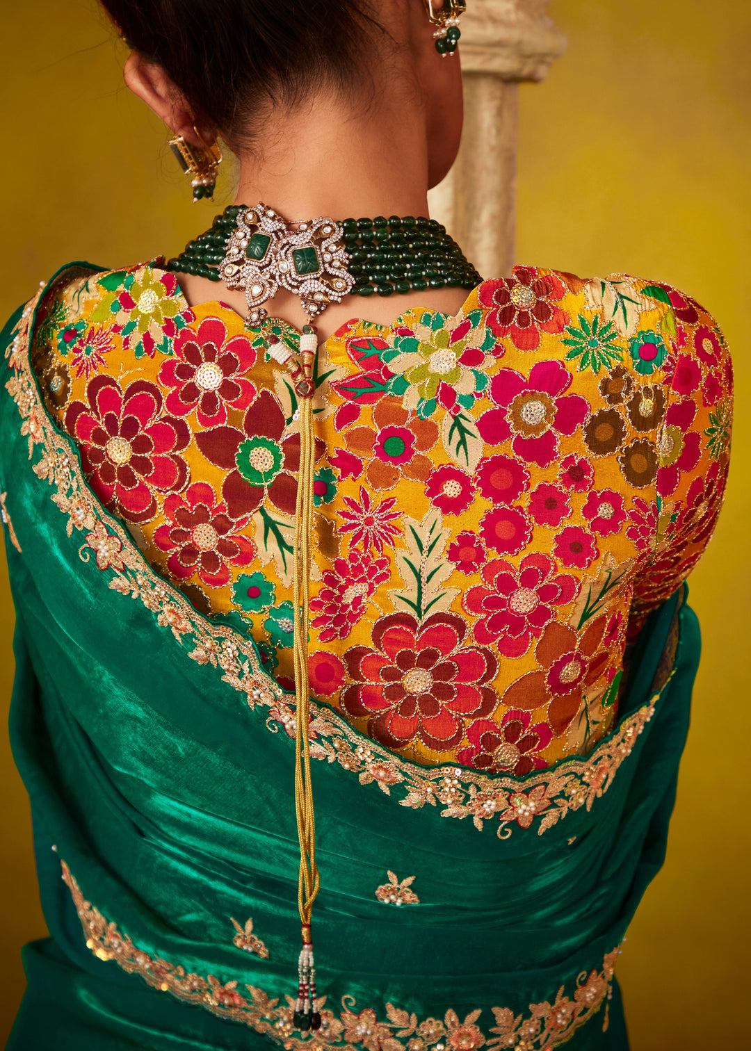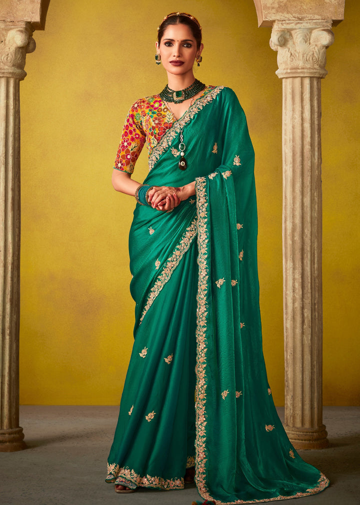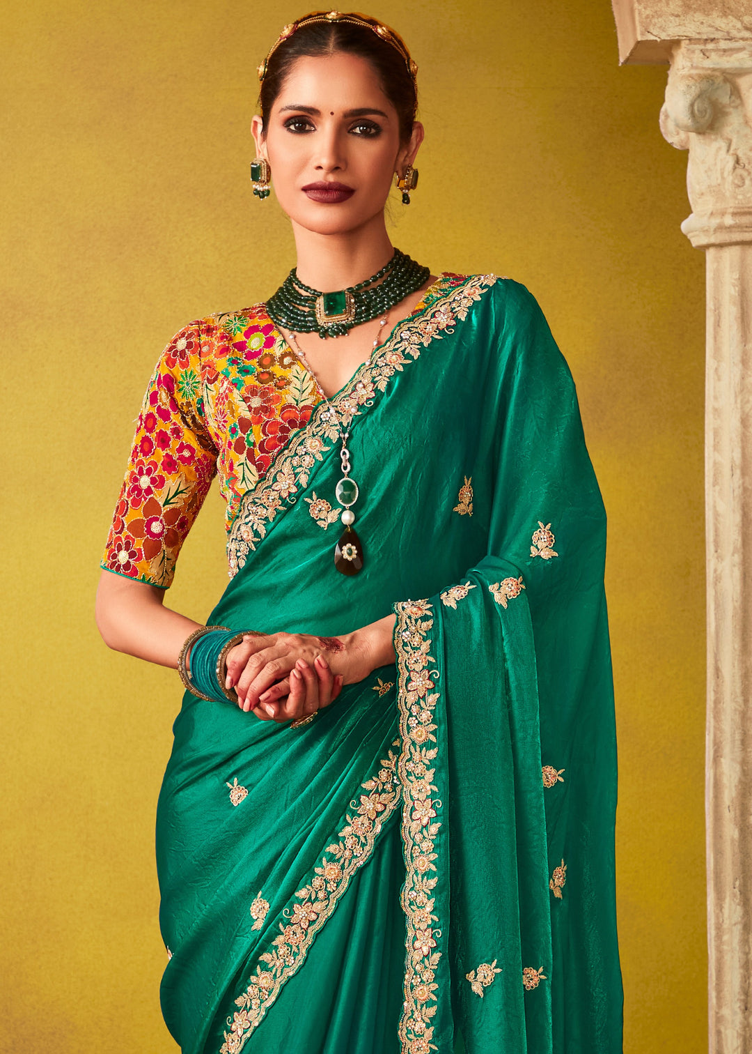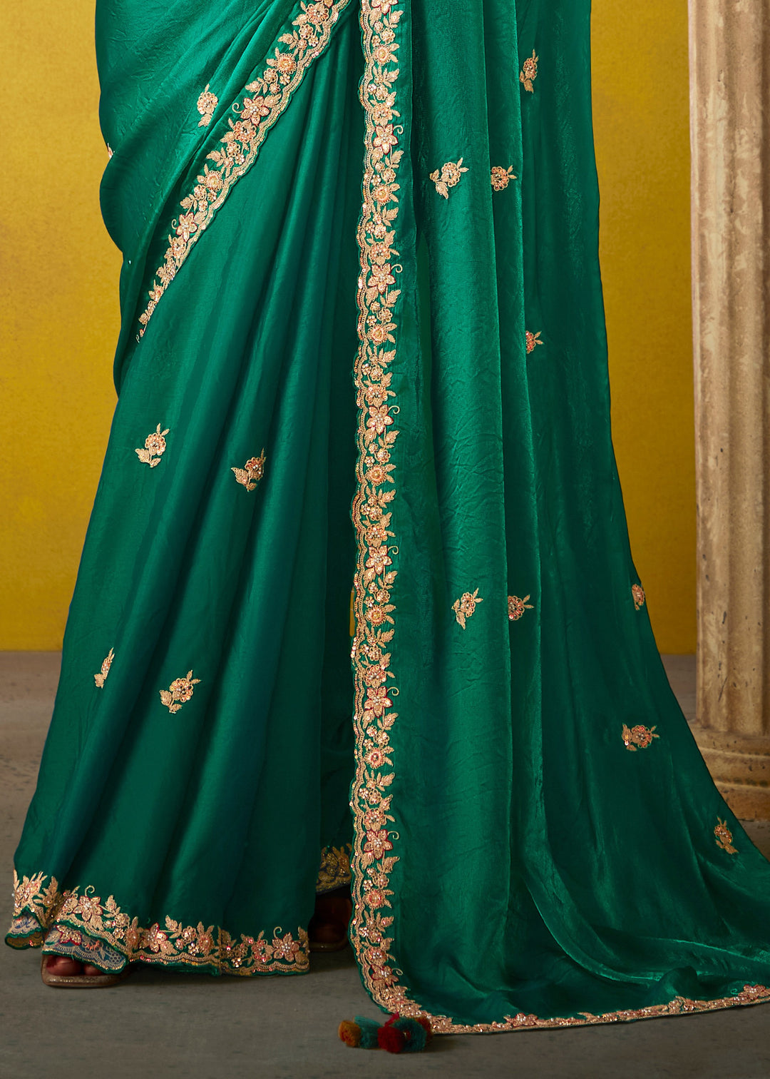 Bottle Green Glass Tissue Silk Saree With Sequins And Thread Embroidered Work