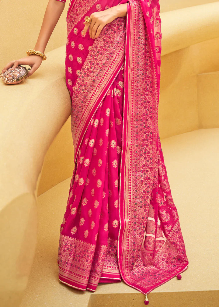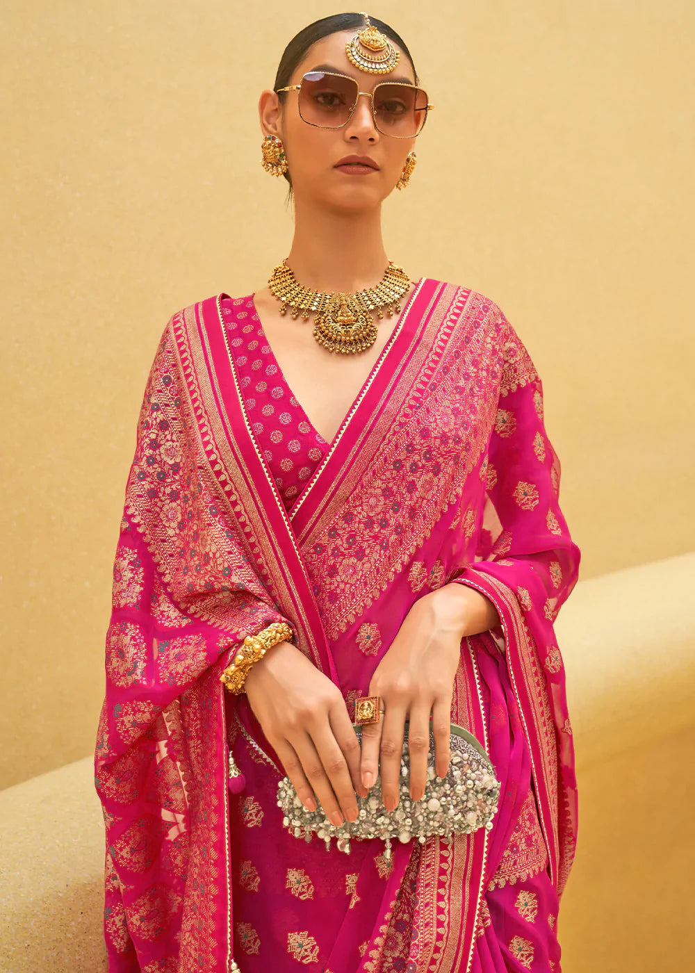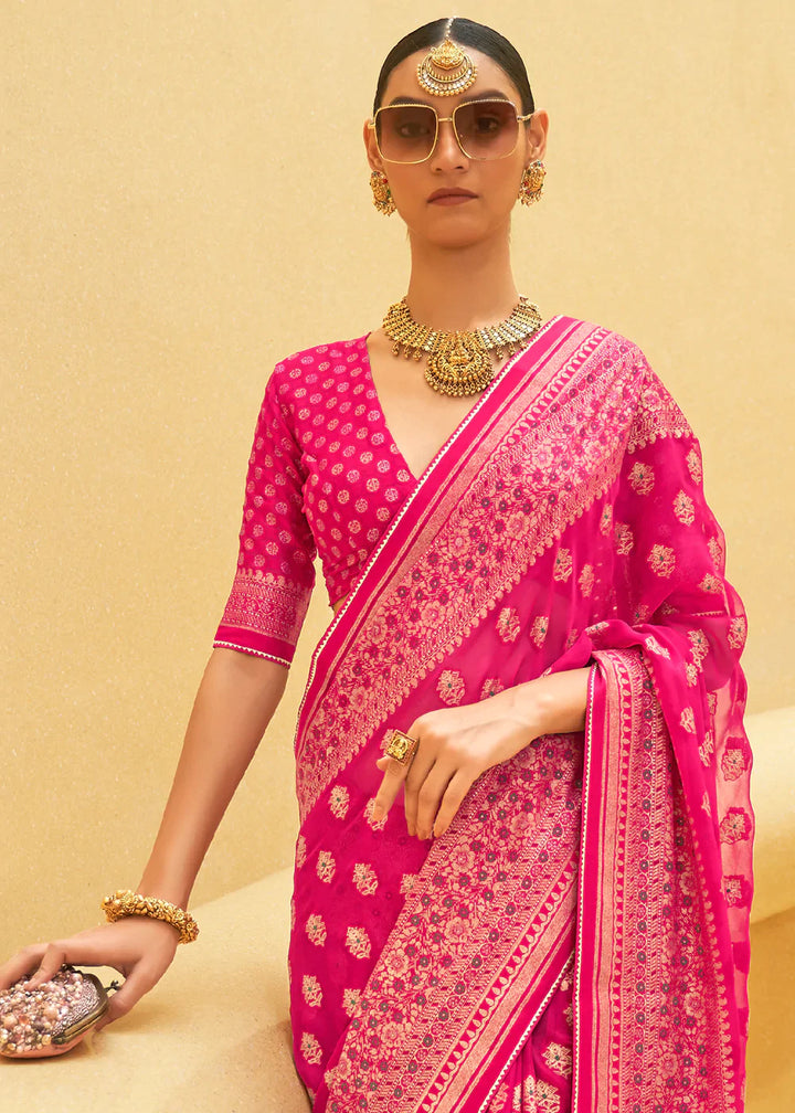 Bright Pink Zari Woven Brasso Organza Silk Saree