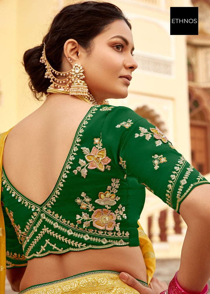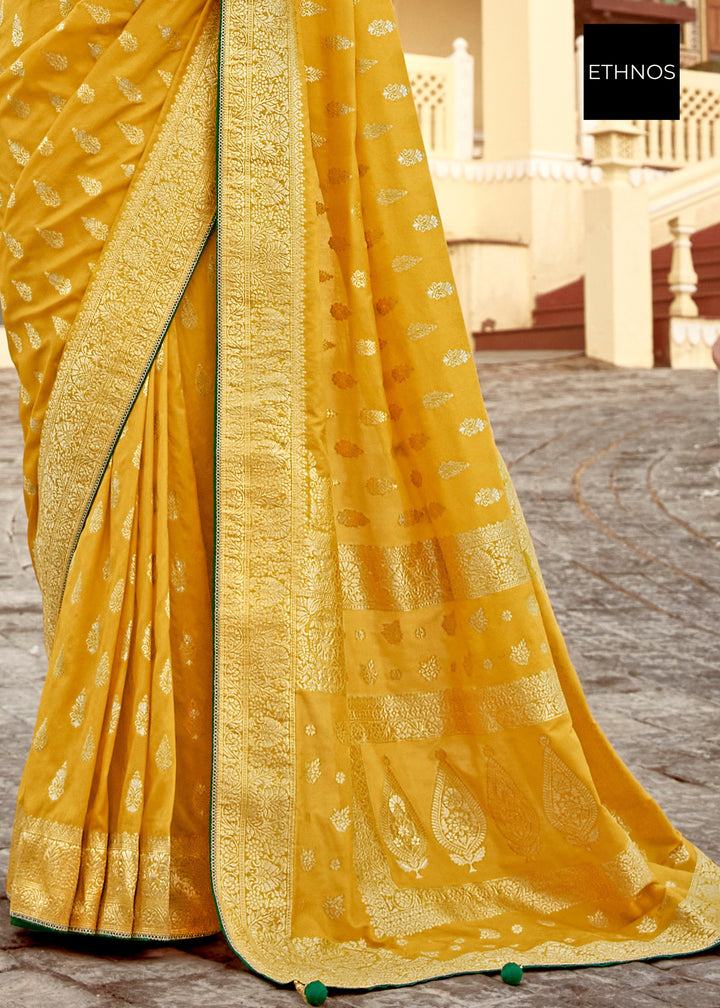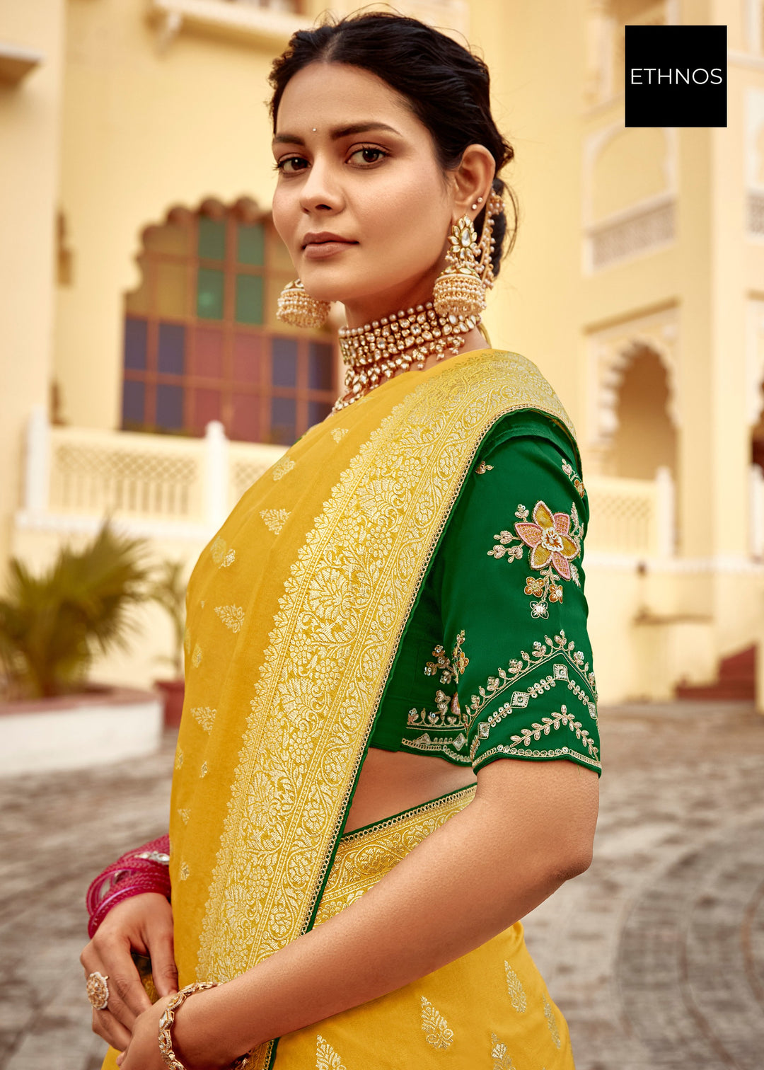 Canary Yellow Dola Silk Saree Embellished With Weaving Work And Heavy Embroidered Blouse