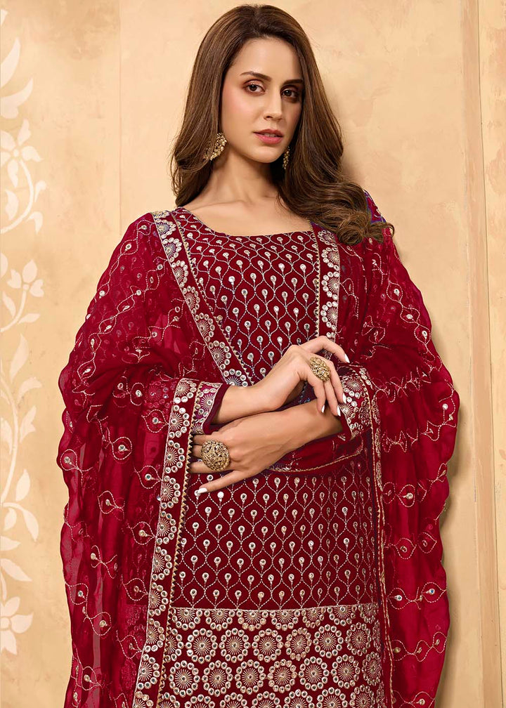 Keep the glam quotient high and leave everyone awestruck with this Cerise Pink Georgette Metti Sharara Suit. An ideal and simplistic grace to notch up your style quotient it is. With a stunning interplay of breathable shades with fine zari weaving, this is a gorgeous pick to make an excellent addition to your ethnic ensembles.