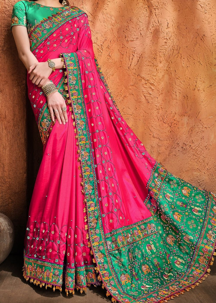 Cerise Pink Pure Satin Saree with Mirror, Resham & Diamond work