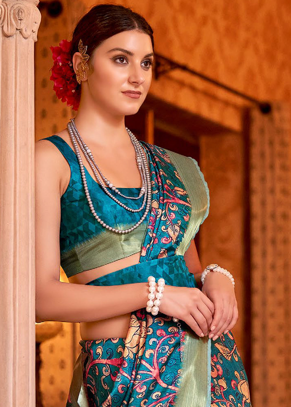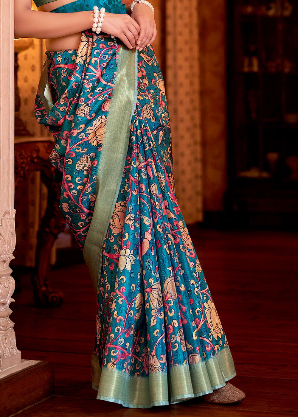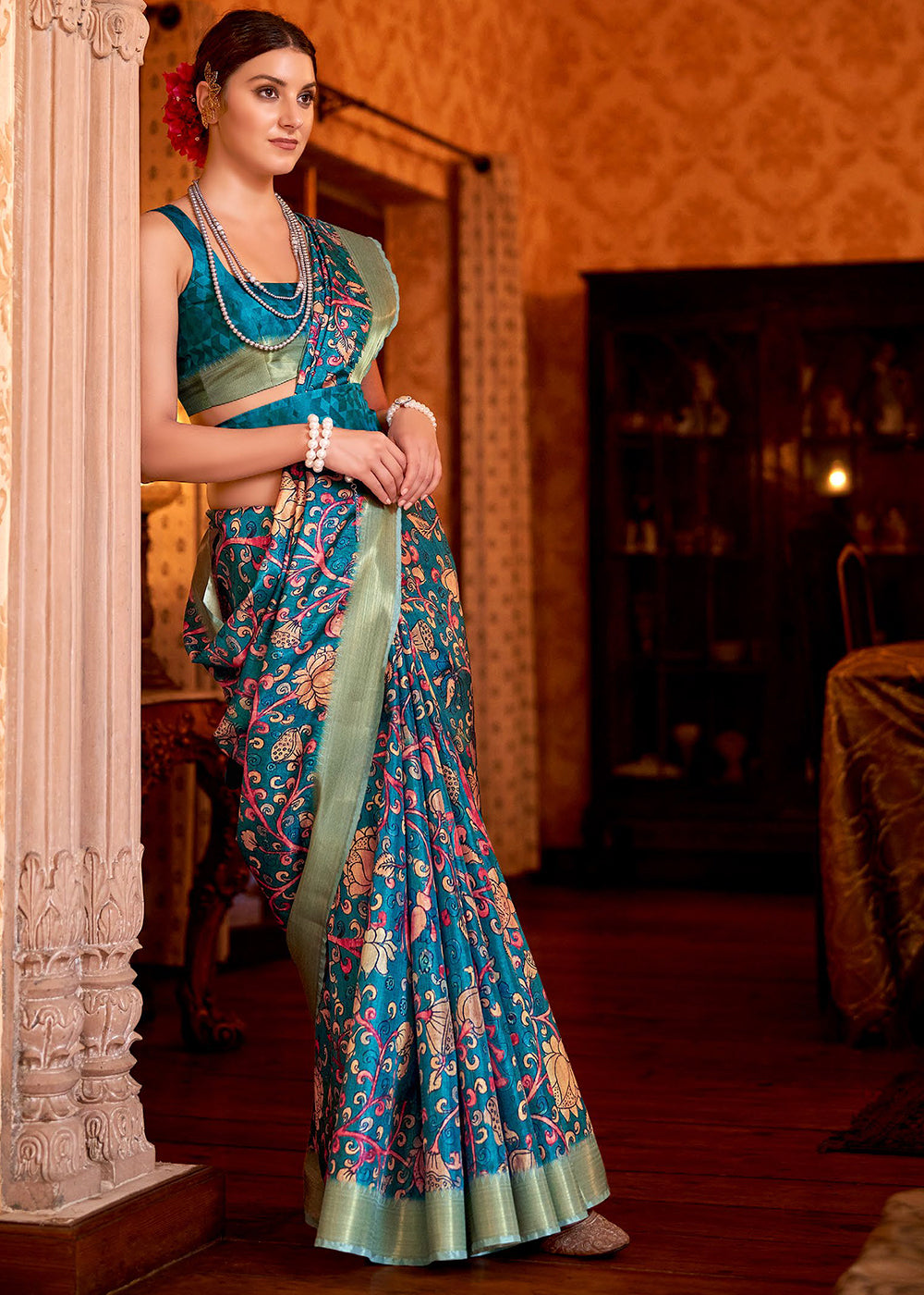 Cerulean Blue Floral Printed Manipuri Silk Saree