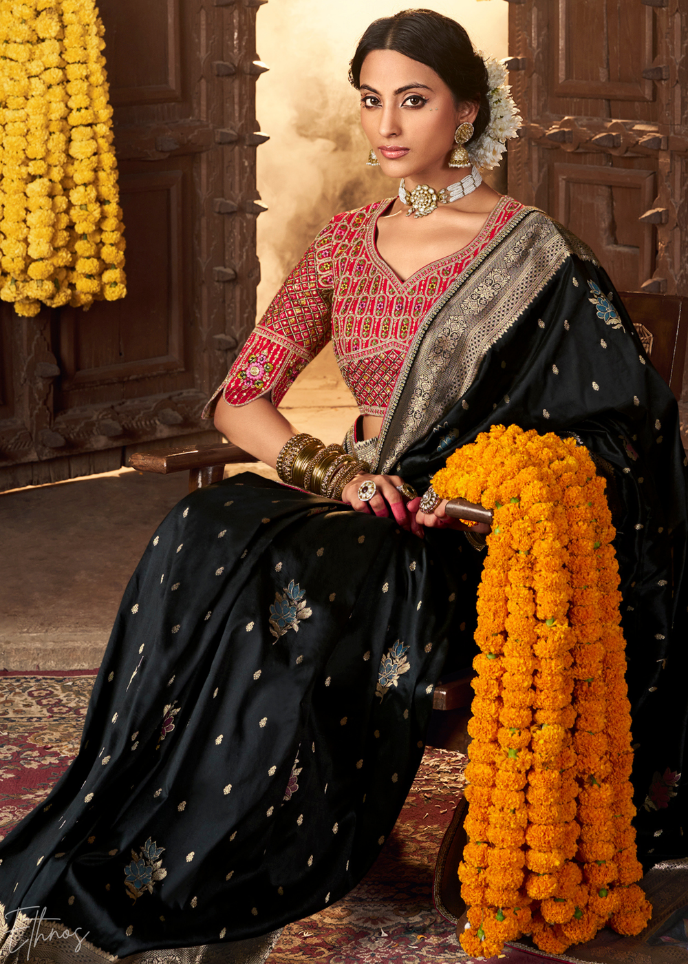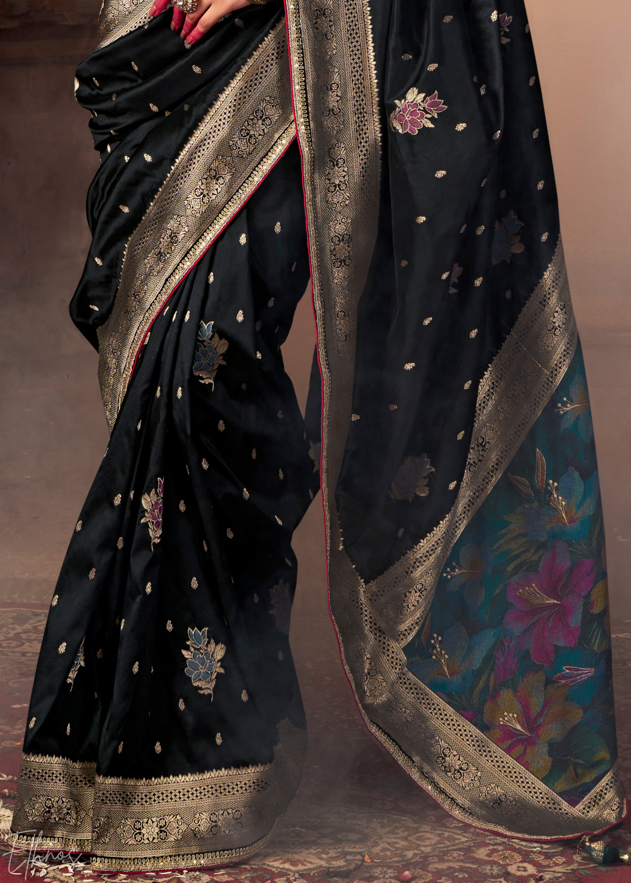 Crafted from pure silk, this saree features an elegant lace border and a richly embellished pallu, delivering sophisticated drape and refined texture. The charcoal black hue provides versatile styling options for both traditional and contemporary occasions, while the quality silk construction ensures lasting comfort and a luxurious appearance.