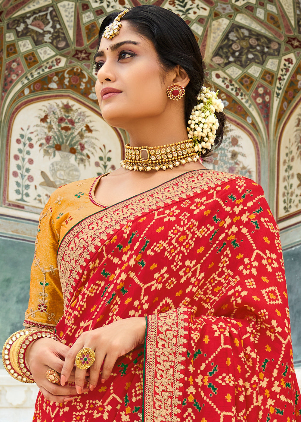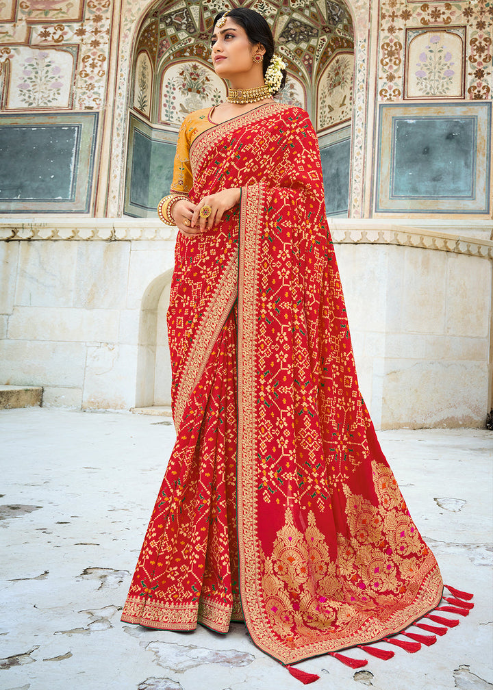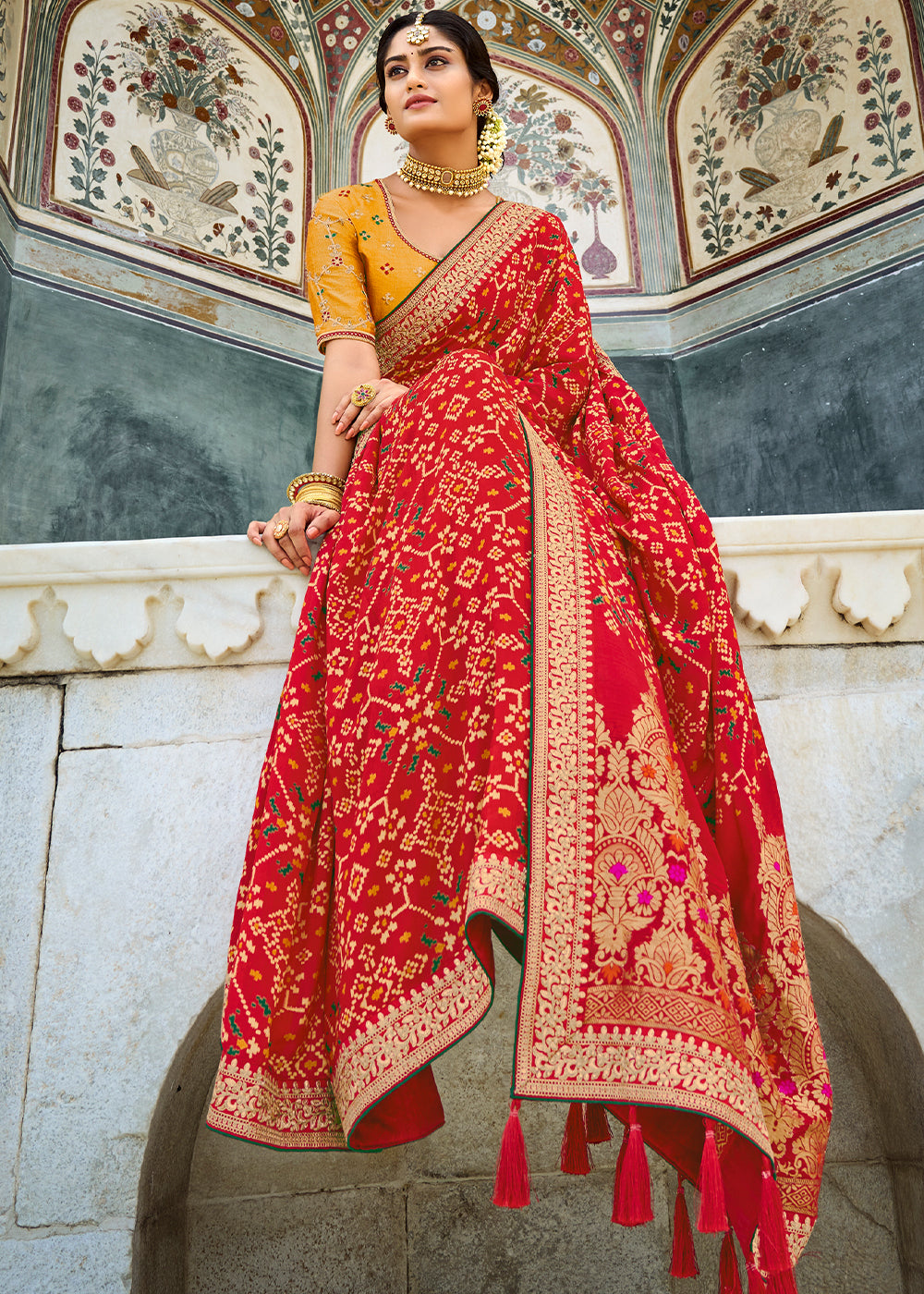Gear up to the nines with this royal artistic splendour! A queenly charm especially curated for a fabulous event, this Cherry Red Dola Silk Saree is an elegant charm to bring an exotic flair to your attire. Be it a fun get together or an evening soiree, this will work everywhere!