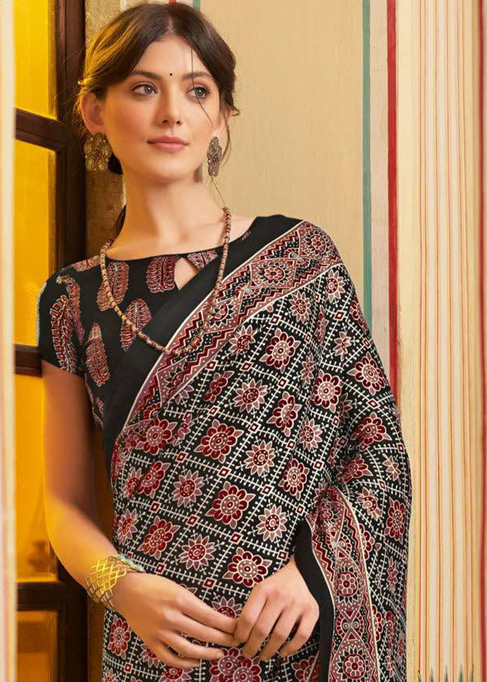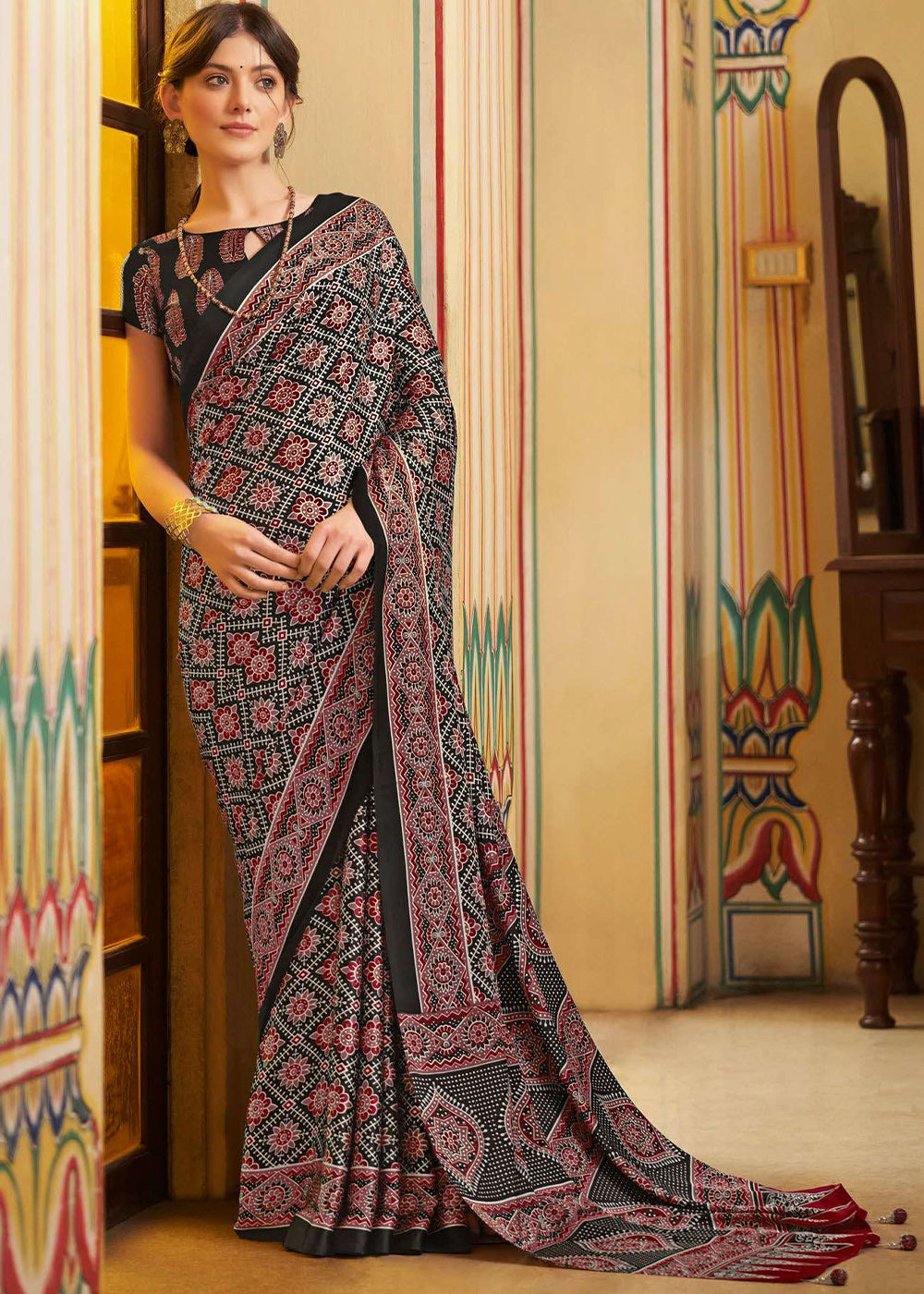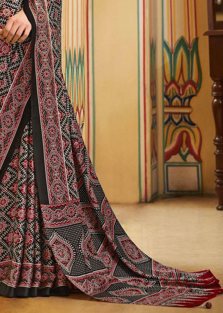 Coal Black Ajrakh Printed Satin Crepe Saree:Summer Collection
