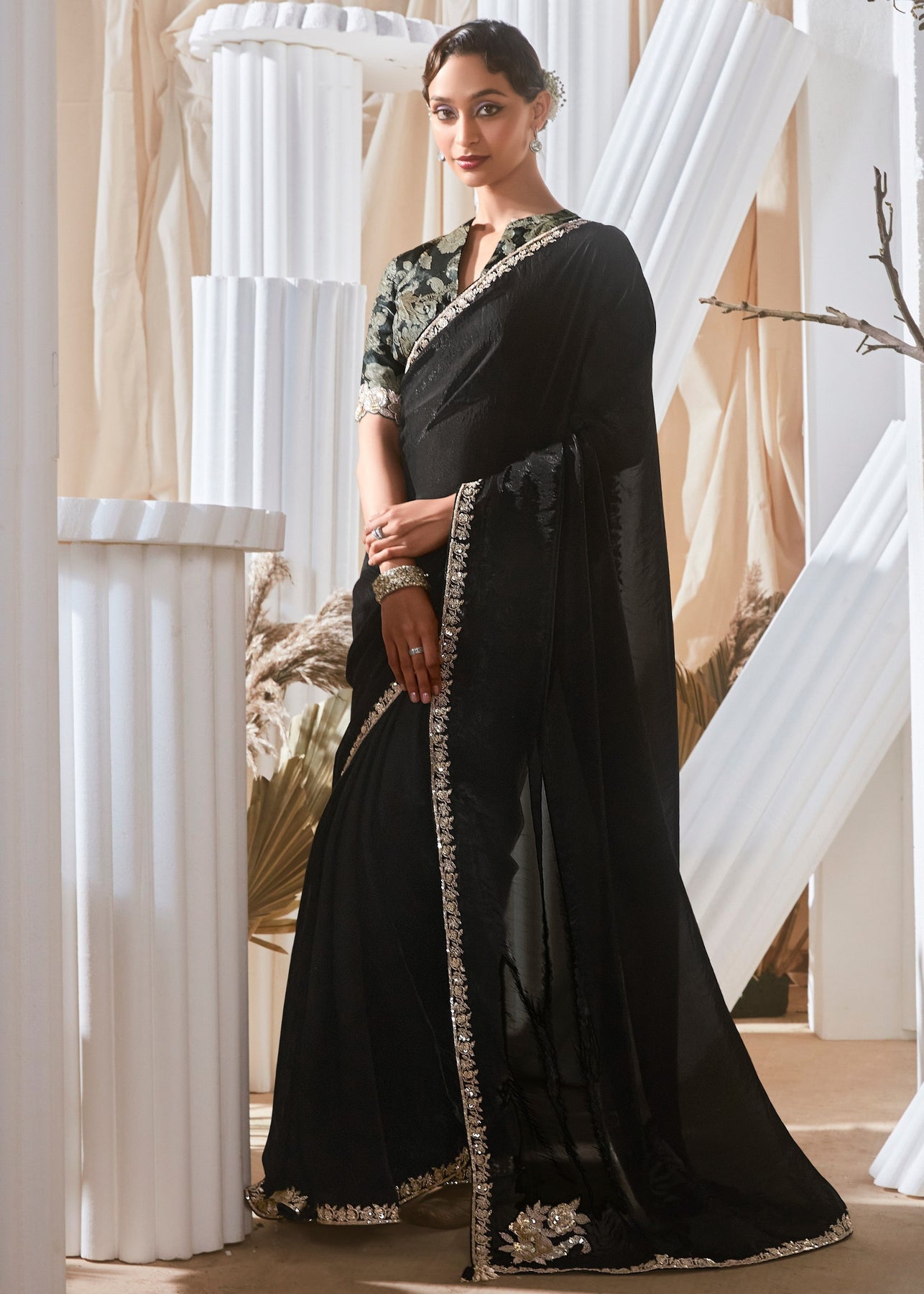 Drape elegance in deep coal‑black with this fancy silk saree that radiates timeless sophistication. A complementary printed blouse adds delightful contrast, turning classic into contemporary chic. Crafted in a smooth blended silk, the fabric flows beautifully while offering subtle sheen under light, it’s perfect for formal gatherings or festive soirées.