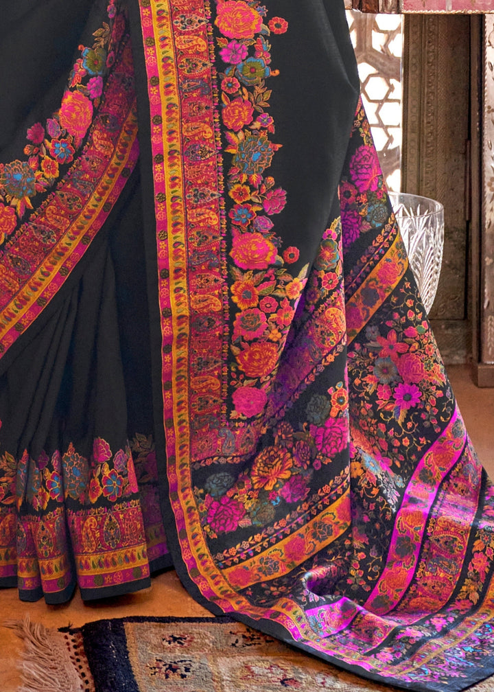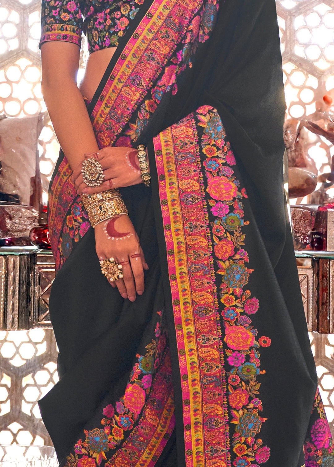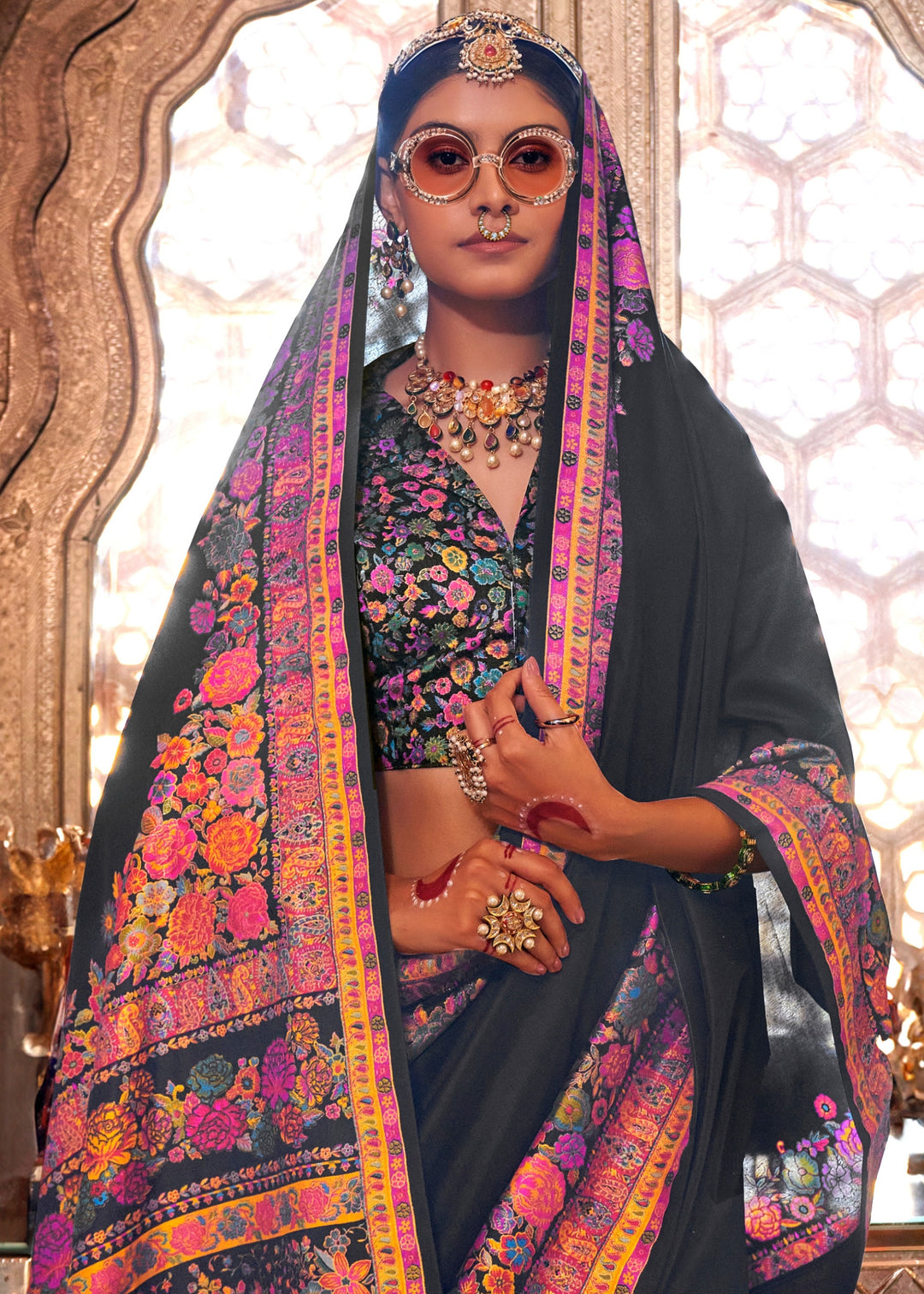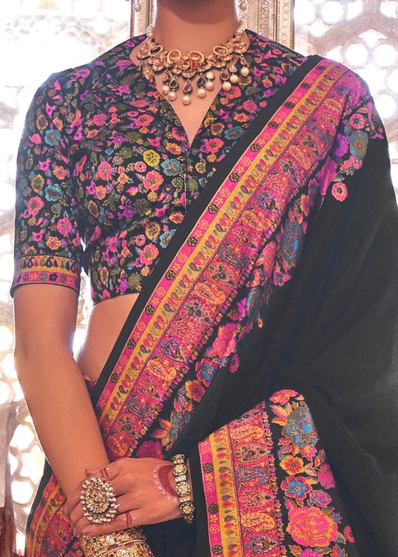 Coal Black Silk Saree With Luxury Print And Glory Finish