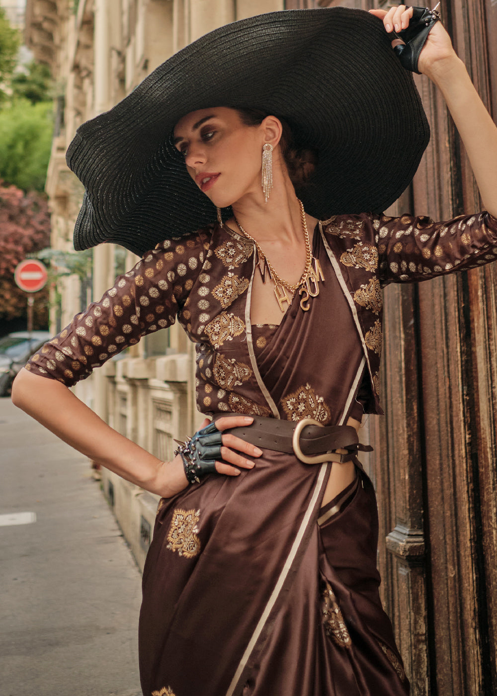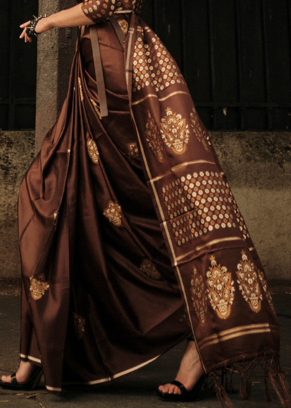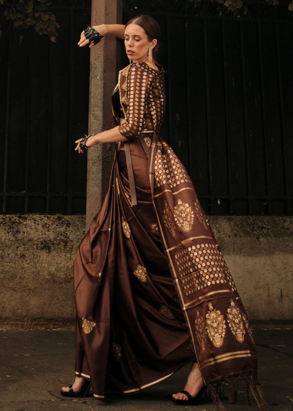Representing an ideal fusion of traditional craftsmanship, intricate weaving techniques, and sumptuous fabric, eloquently curated in the lavish hues of Coffee Brown, this satin silk saree is a top-notch choice for casual evenings. The sophisticated touch of handloom weaving instils a spark in this artistic piece. Pairing temple earrings can surely match its vibe.