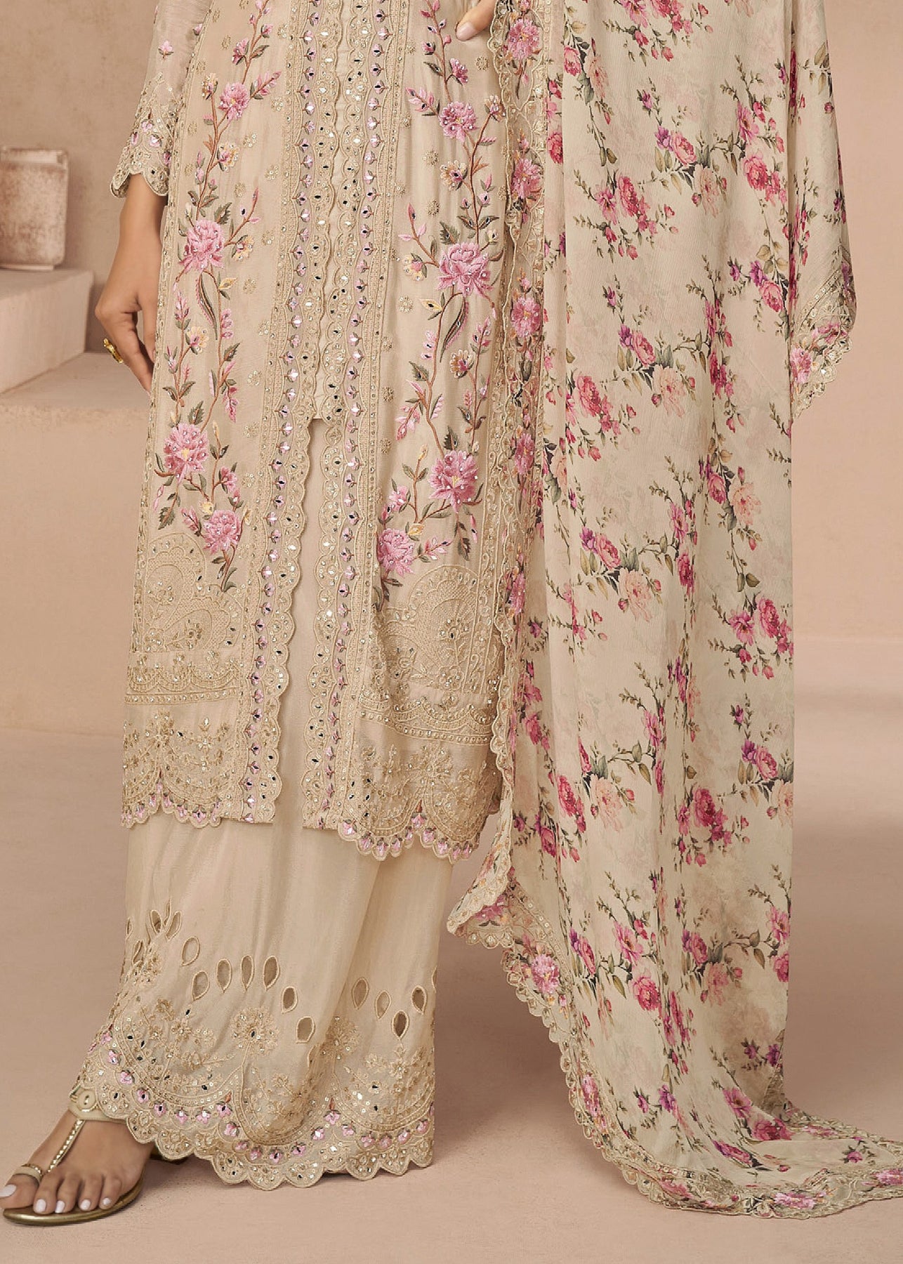 The **Cream Airtex Chinon Salwar Suit** is the perfect blend of comfort, elegance, and tradition. Its soothing cream base radiates sophistication, making it versatile enough for festive occasions, family gatherings, or even intimate celebrations. The **Airtex Chinon fabric** drapes beautifully, offering a graceful silhouette that flatters every body type. Paired with a digitally printed **Chinon dupatta**, the ensemble achieves a delicate balance of subtle charm and eye-catching detail.