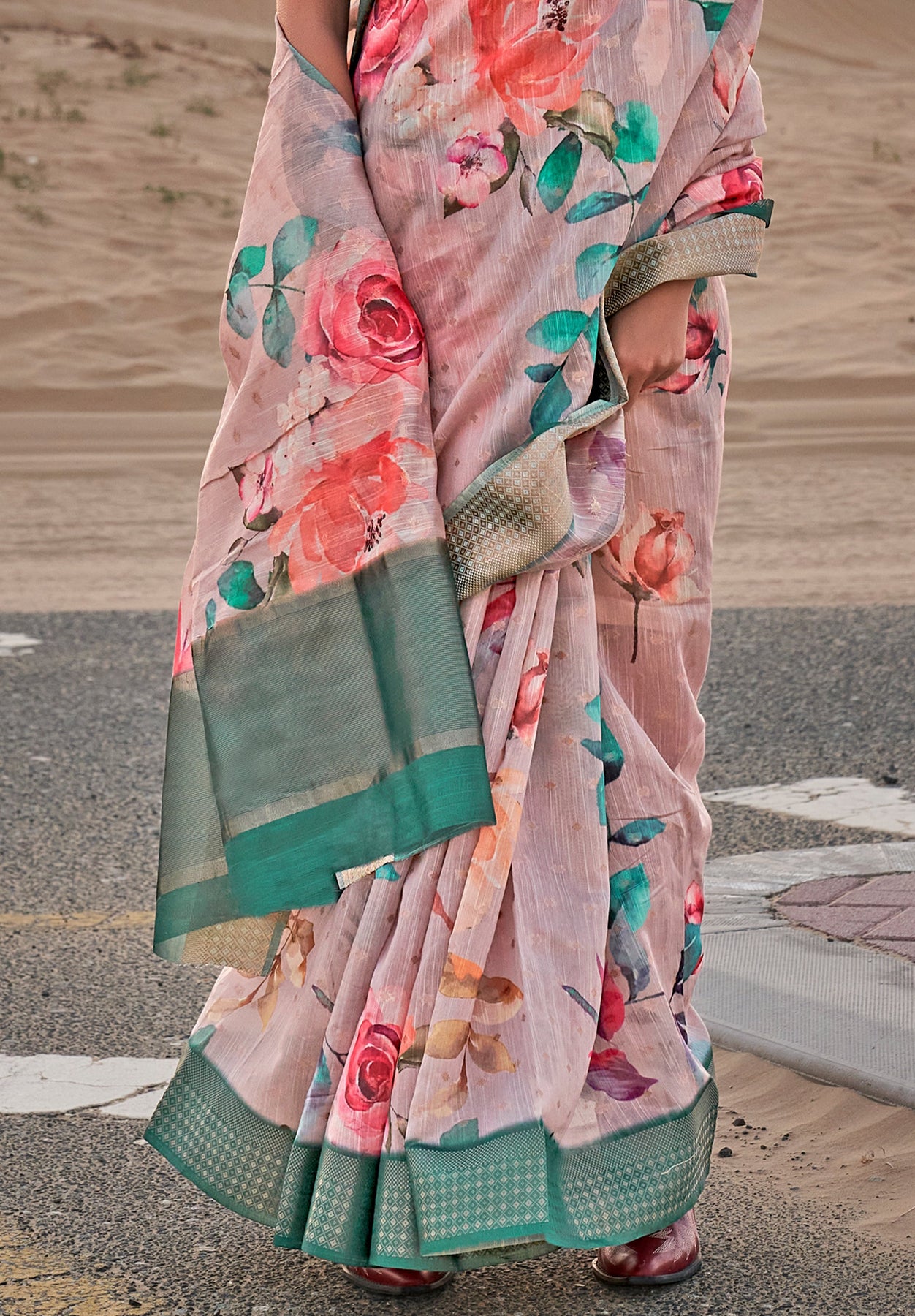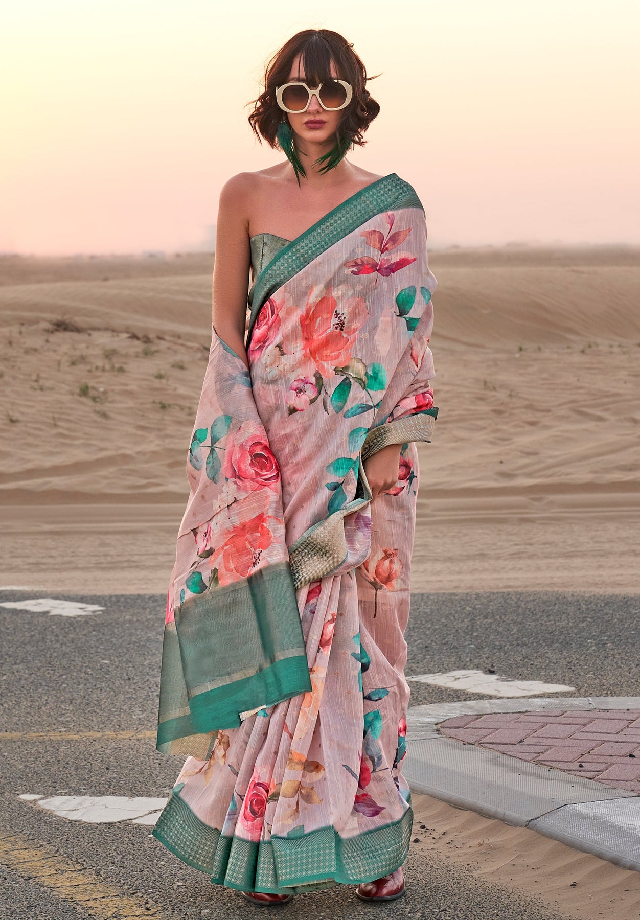 Creamy White Floral Printed Linen Saree with Zari Border and Blouse