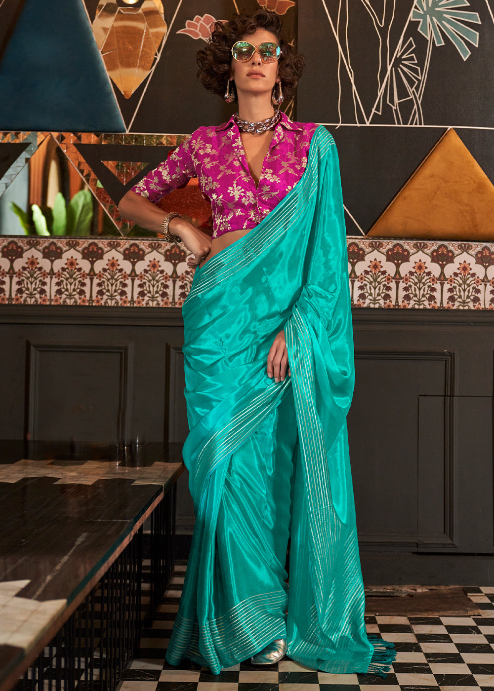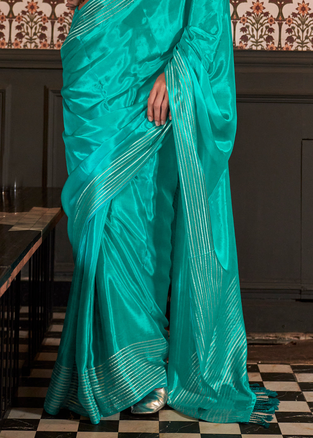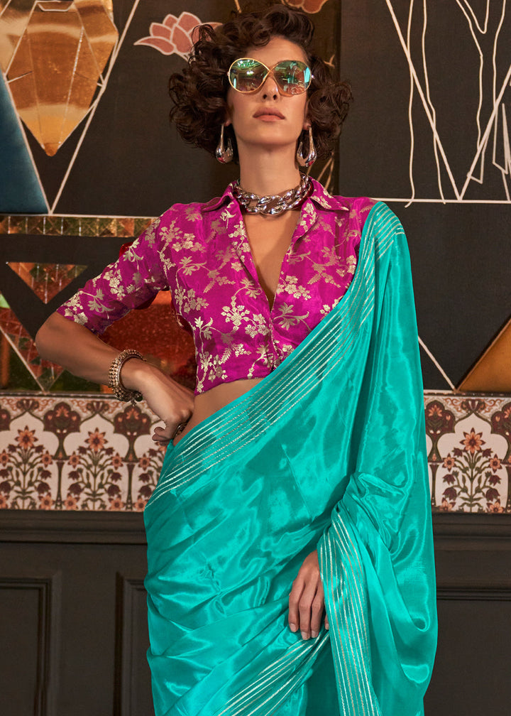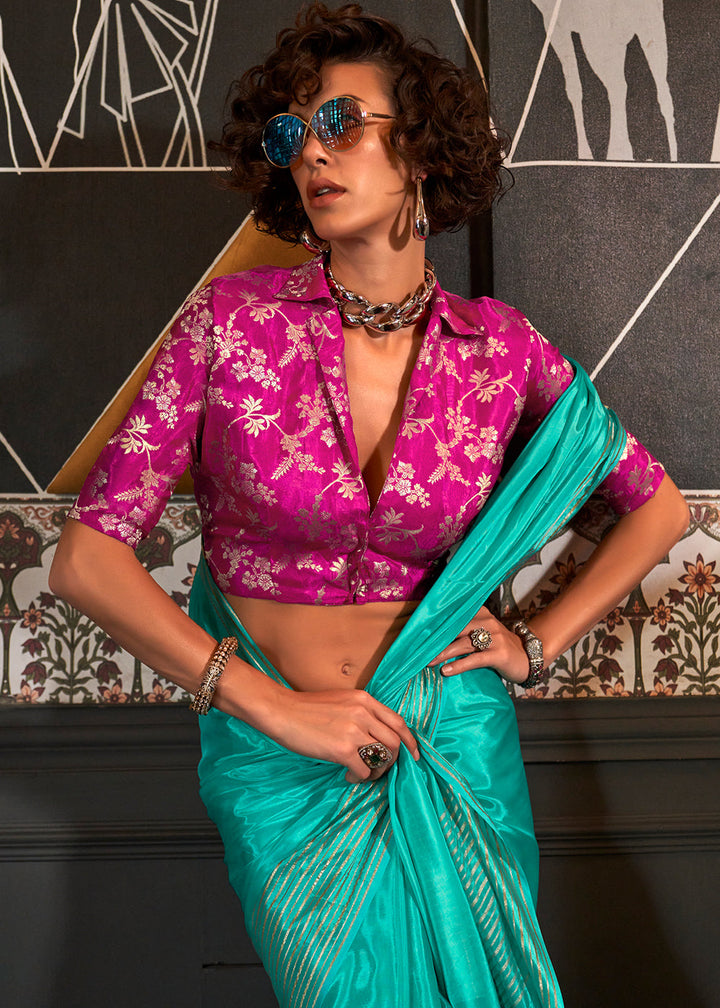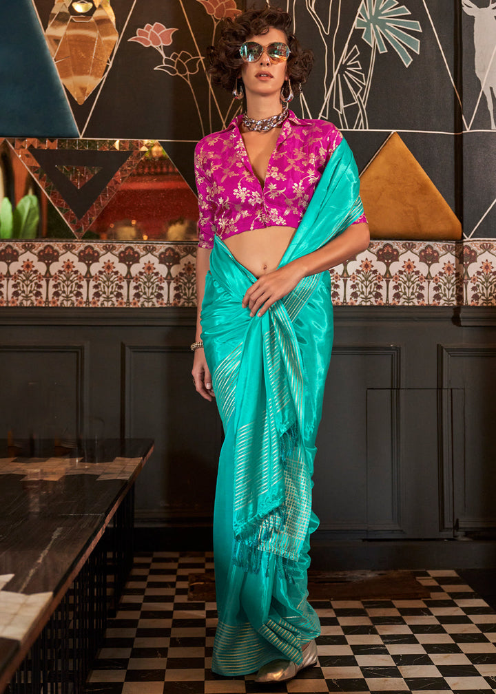Cyan Blue Handloom Woven Viscose Satin Saree with Contrast Blouse