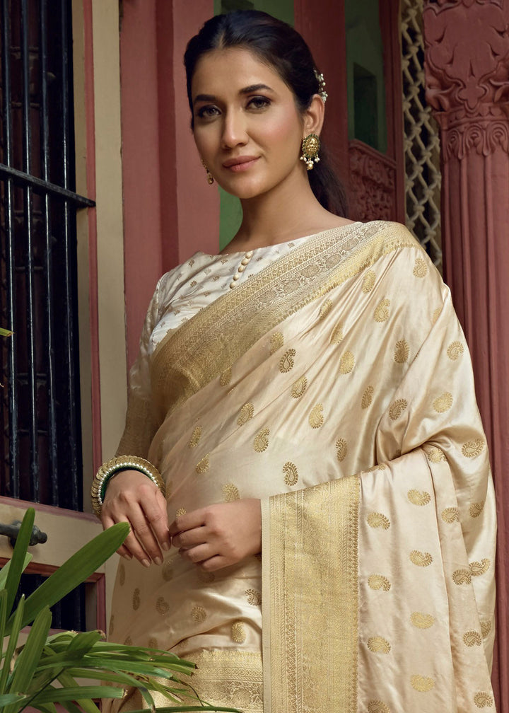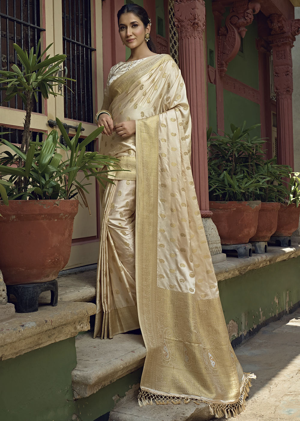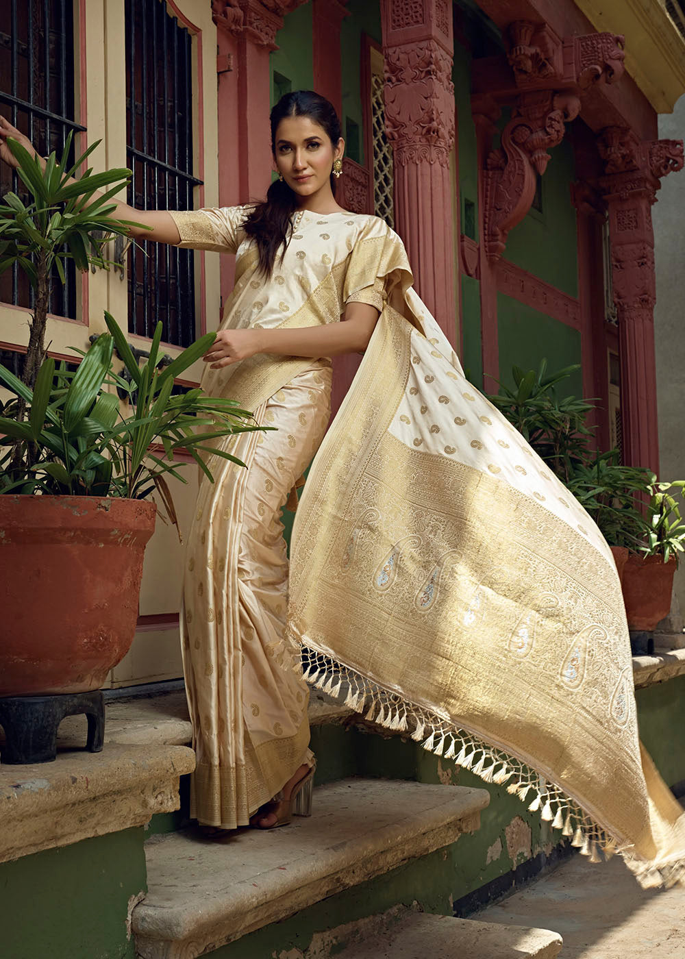 Presenting a mindful and tasteful Woven Designer Satin Silk Saree for the diva in you. Satin silk is highly admired in the clothing line for its royal appeal, strength and durability. This Daisy White beauty comes embellished with a floral design and a contrasting golden border to be a terrific pick for special occasions.