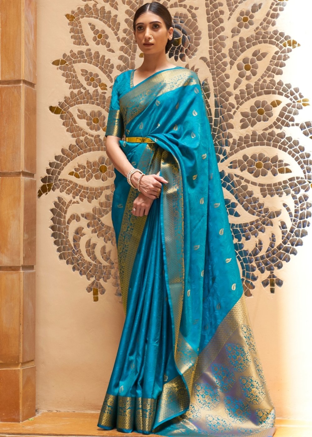 Gorgeous attires for the gorgeous you! An artistic masterpiece from Kancheepuram in Tamil Nadu, India, this Dodger blue Woven Kanjivaram Silk Saree is here to make you glitter in aristocratic vogue. Grand in appeal and high in charm, pair this classic drape with a matching Potli bag and make heads turn to you.