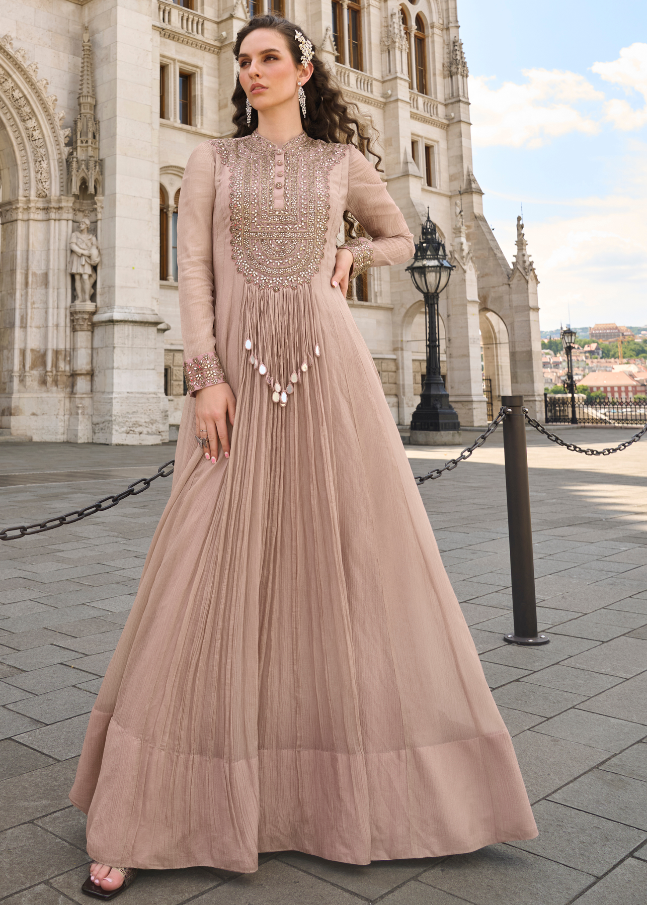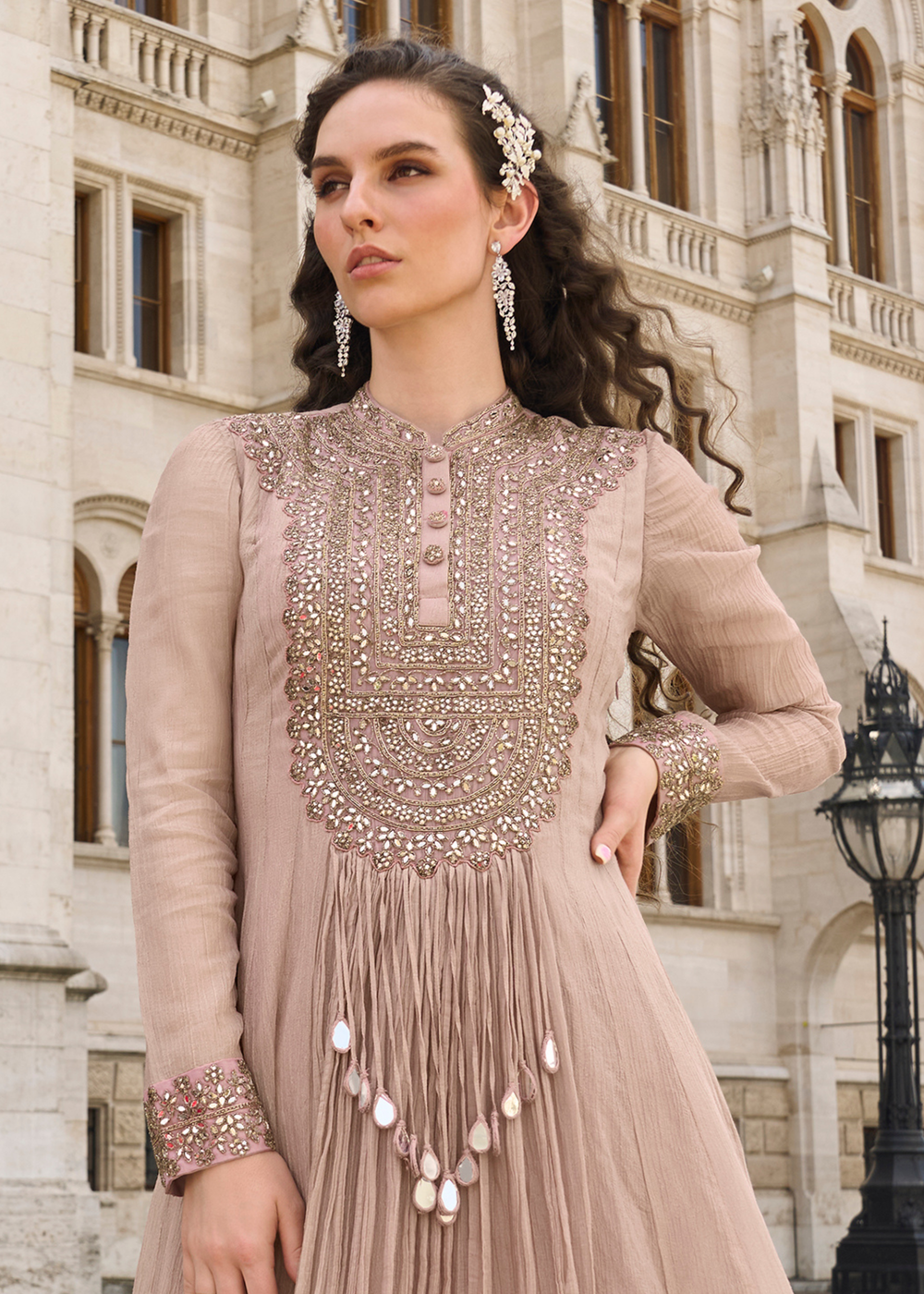 This Gown is offered in a delicate dusty rose shade — a soft, muted pink that balances subtlety and elegance. The tone gives the outfit a refined, feminine charm, suitable for both day and evening wear. The style captures the ethos of traditional South Asian ensemble (Gown with Dupatta) while maintaining a modern, graceful sensibility. This makes it a versatile choice for a variety of occasions — from festive gatherings and celebrations to more formal functions or parties.
