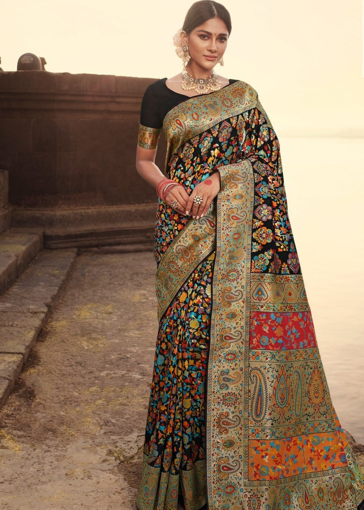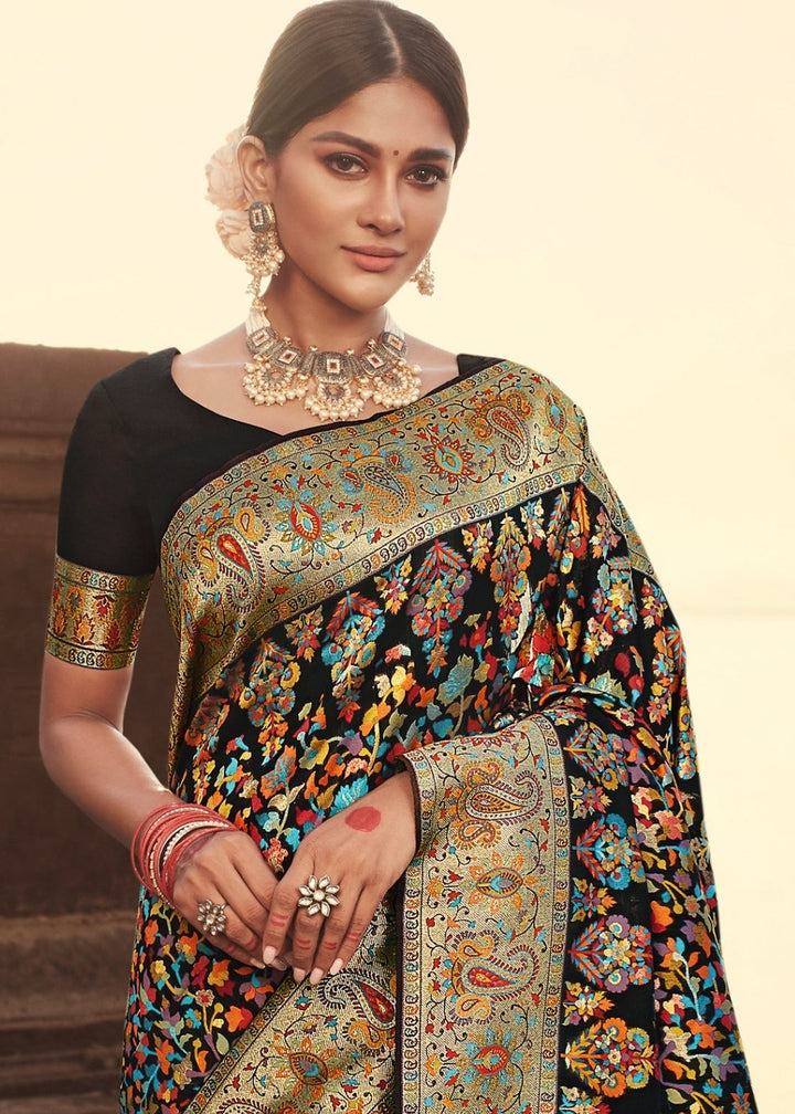 Ebony Black Banarasi Kora Silk Saree with Pashmina Weaving & Zari Border Pallu