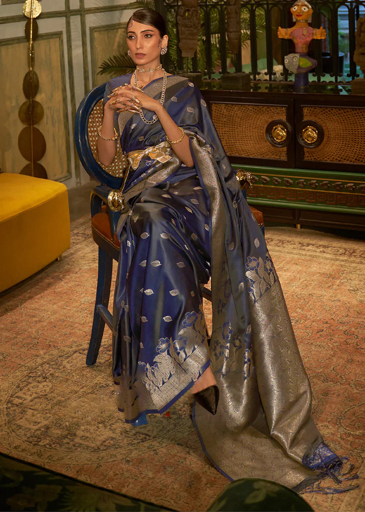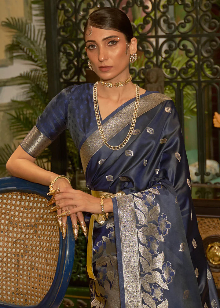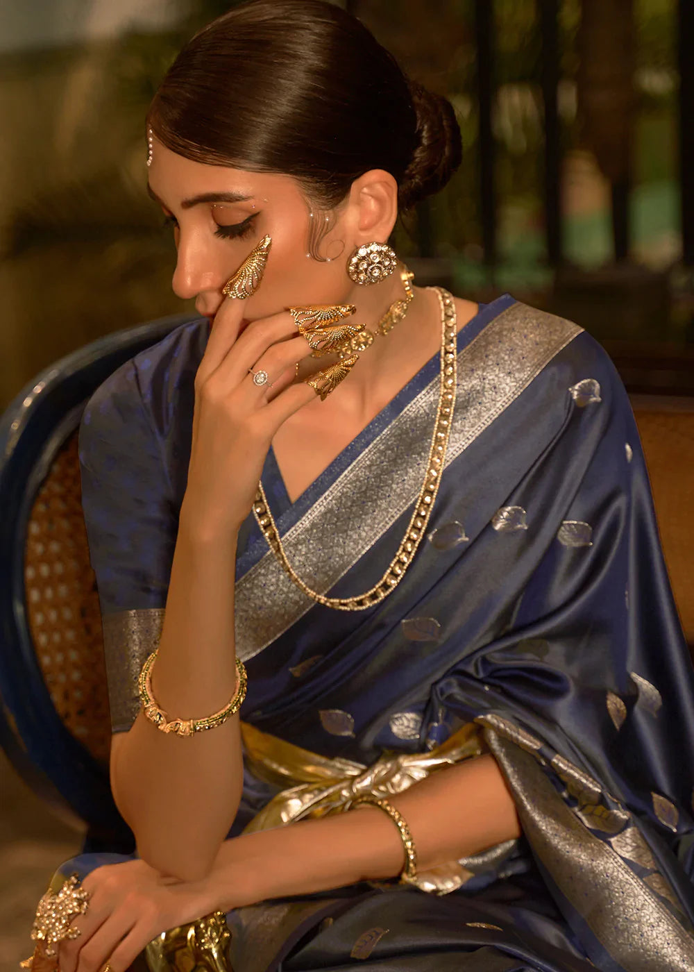 Smooth, shiny, and glossy in every thread, Satin silk sarees redefine style and sophistication like none! This charming French Navy Zari Woven piece comes with a glittering ensemble on the run, adding to its grace. A pretty pick for your special event, this will make you glow, a little extra. Pair this with heels and a trendy hairdo and grab the limelight.