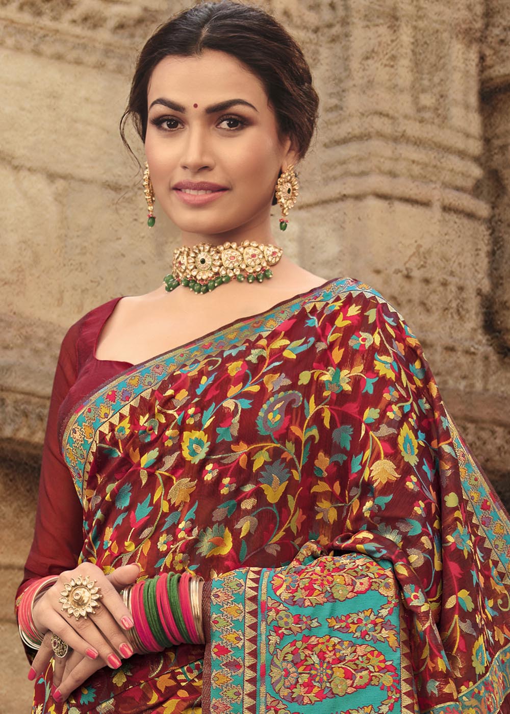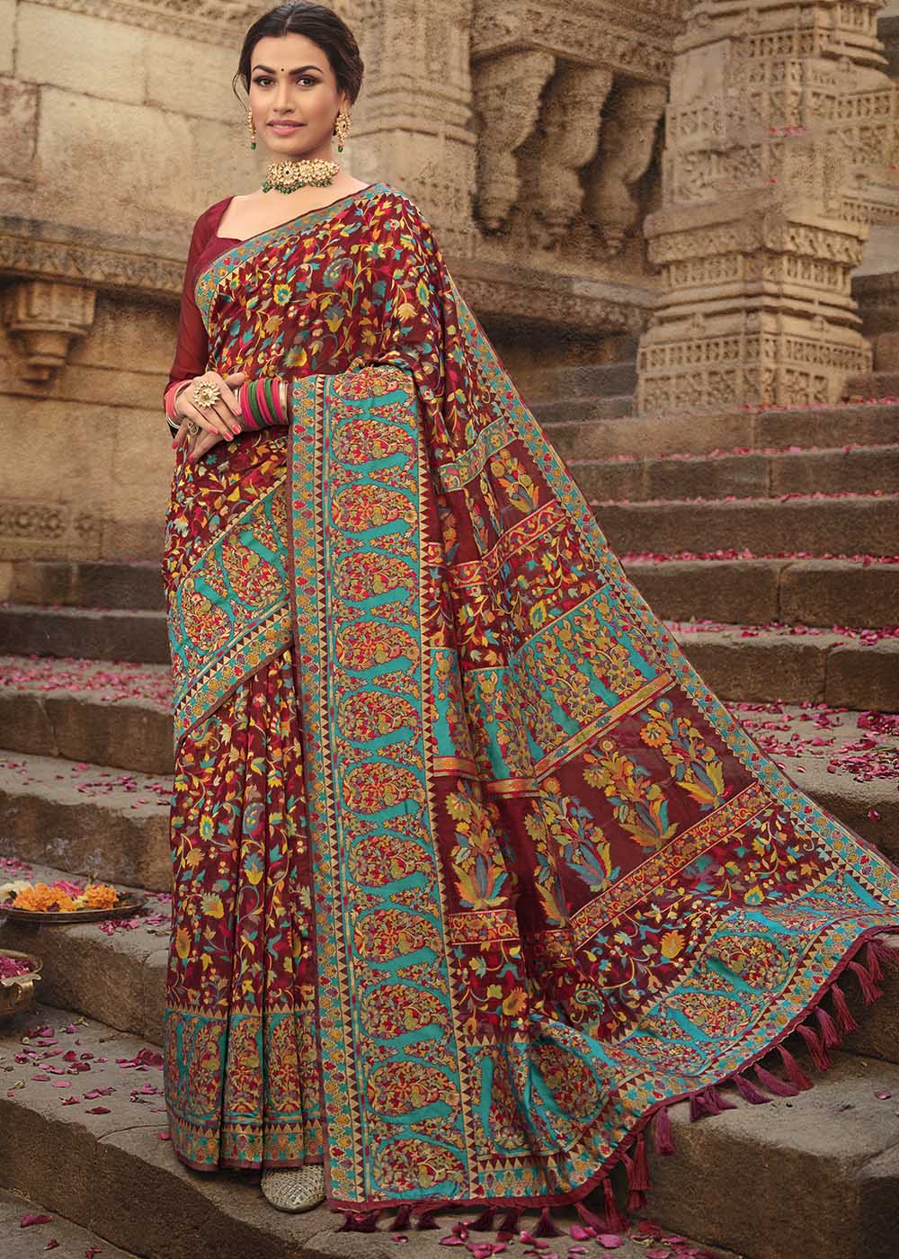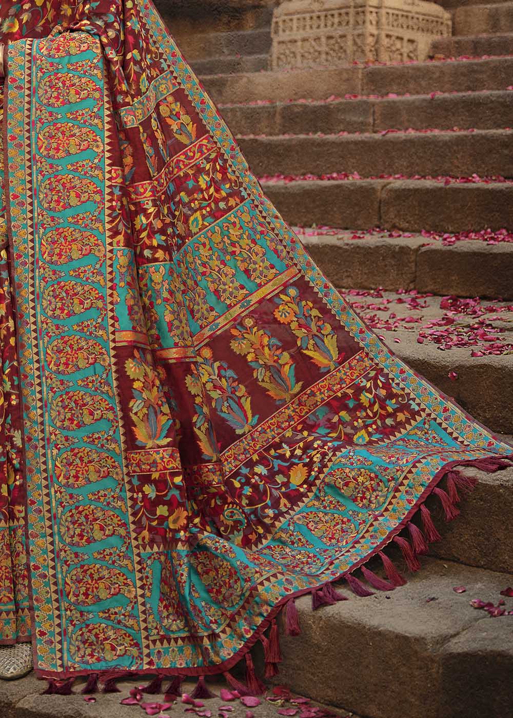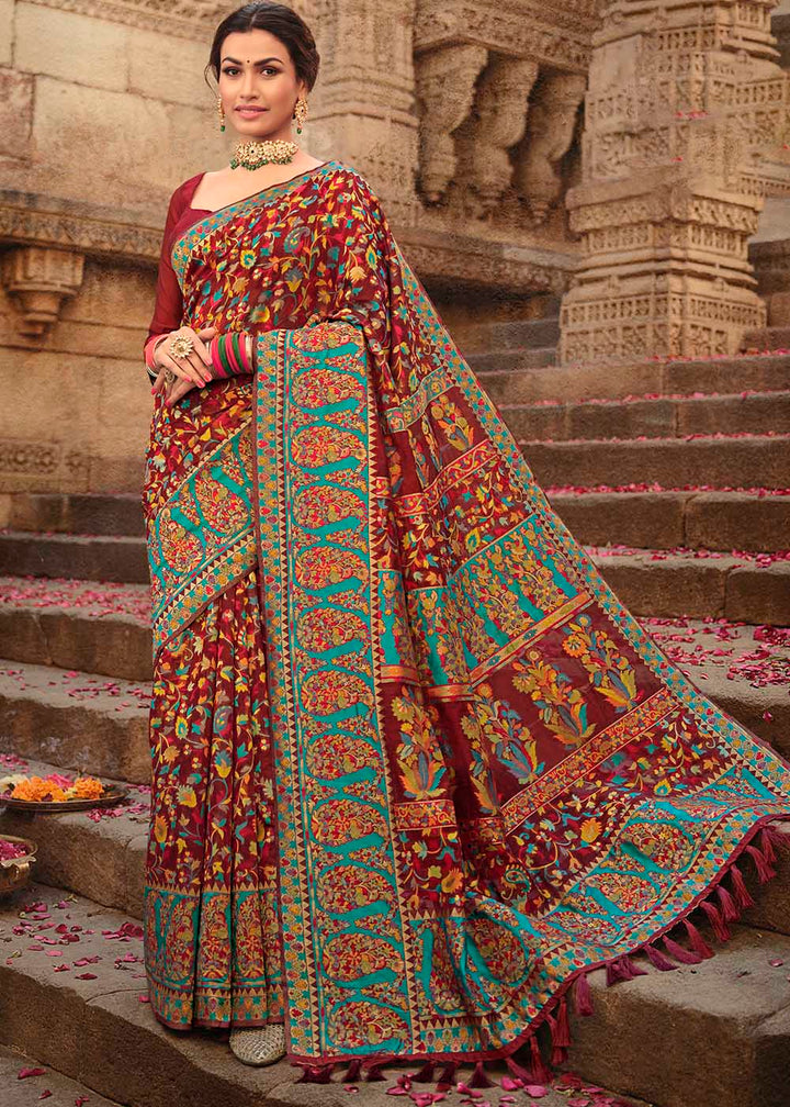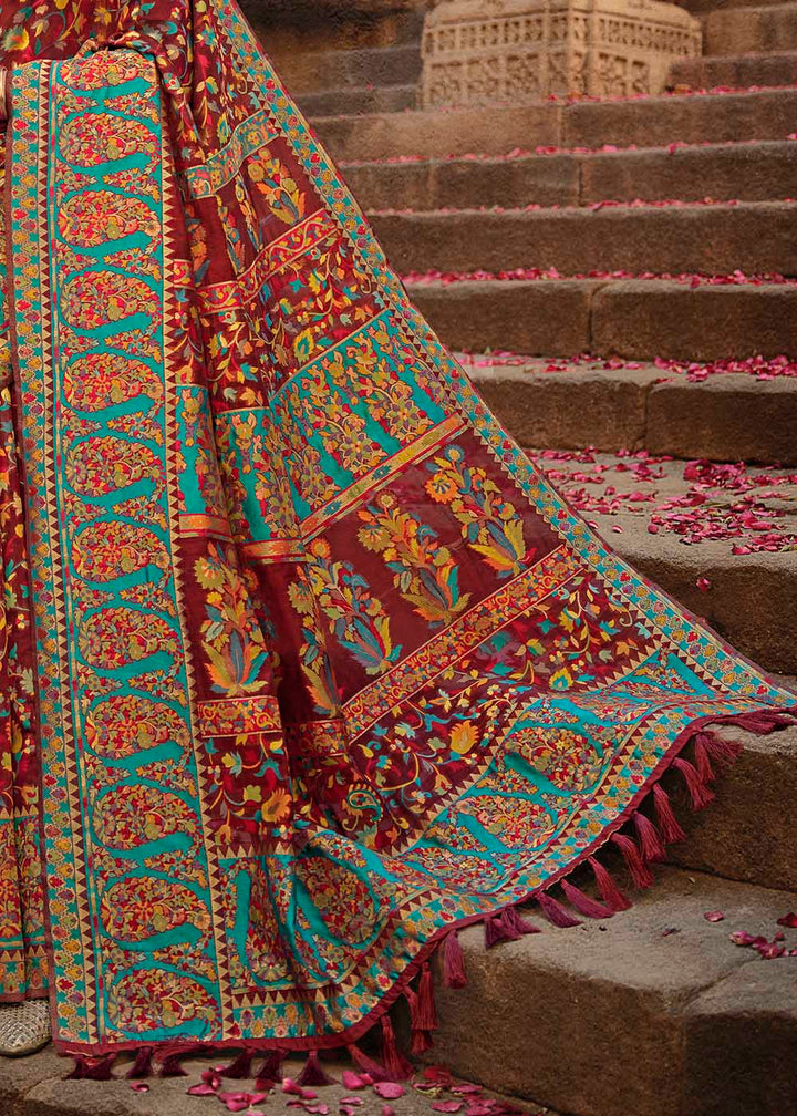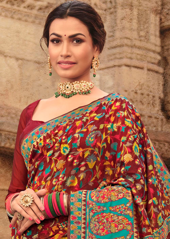 Garnet Red Banarasi Kora Silk Saree with Pashmina Weaving & Zari Border Pallu