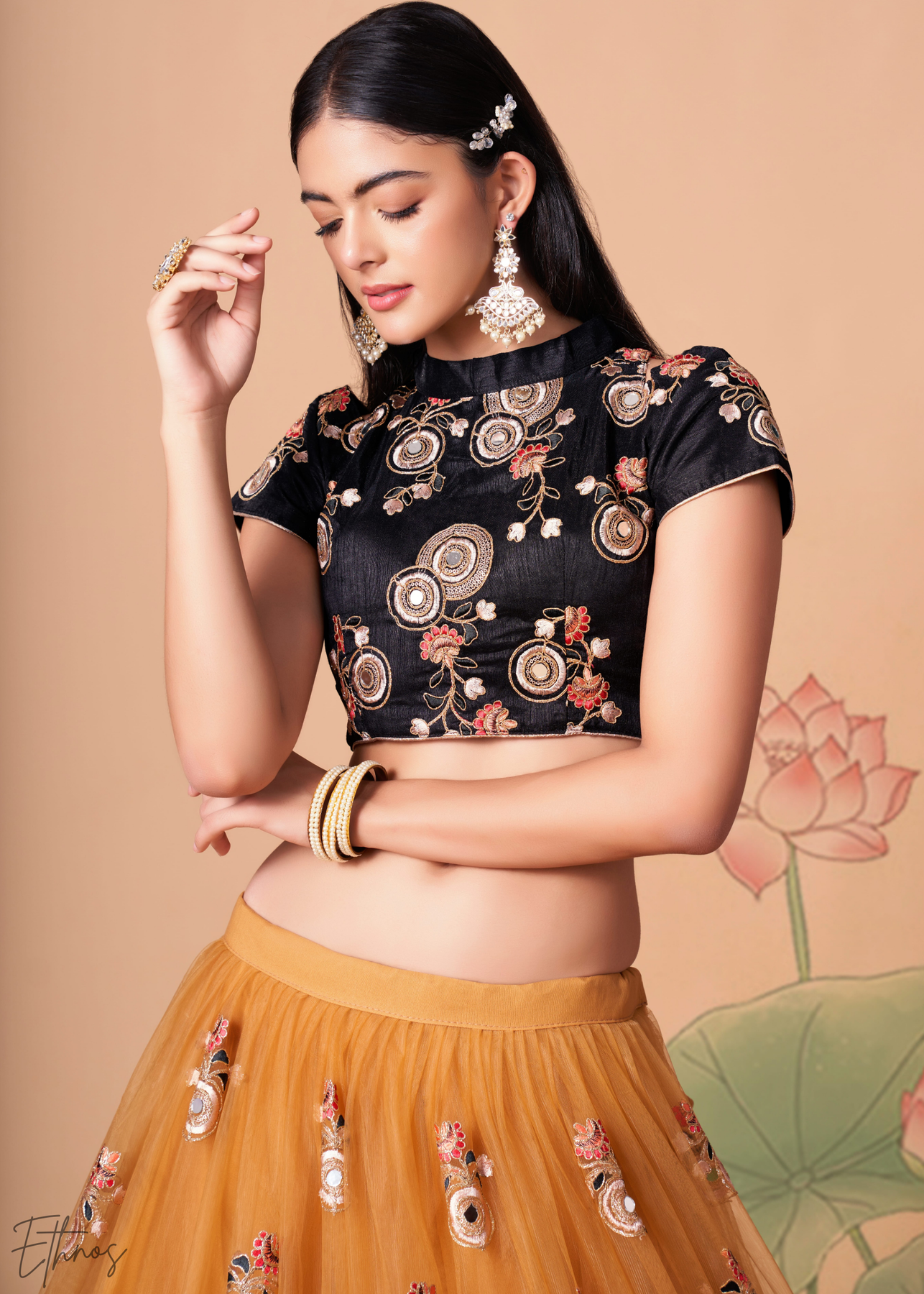 This golden lehenga choli is a striking ensemble, perfect for grand weddings, festive celebrations, or reception events. The flared net skirt and matching sheer dupatta are beautifully detailed with intricate floral thread embroidery and sparkling mirror-work, creating a rich, traditional aesthetic. A contrasting black high-neck blouse, heavily embellished with similar ornate patterns, completes this bold and sophisticated look.