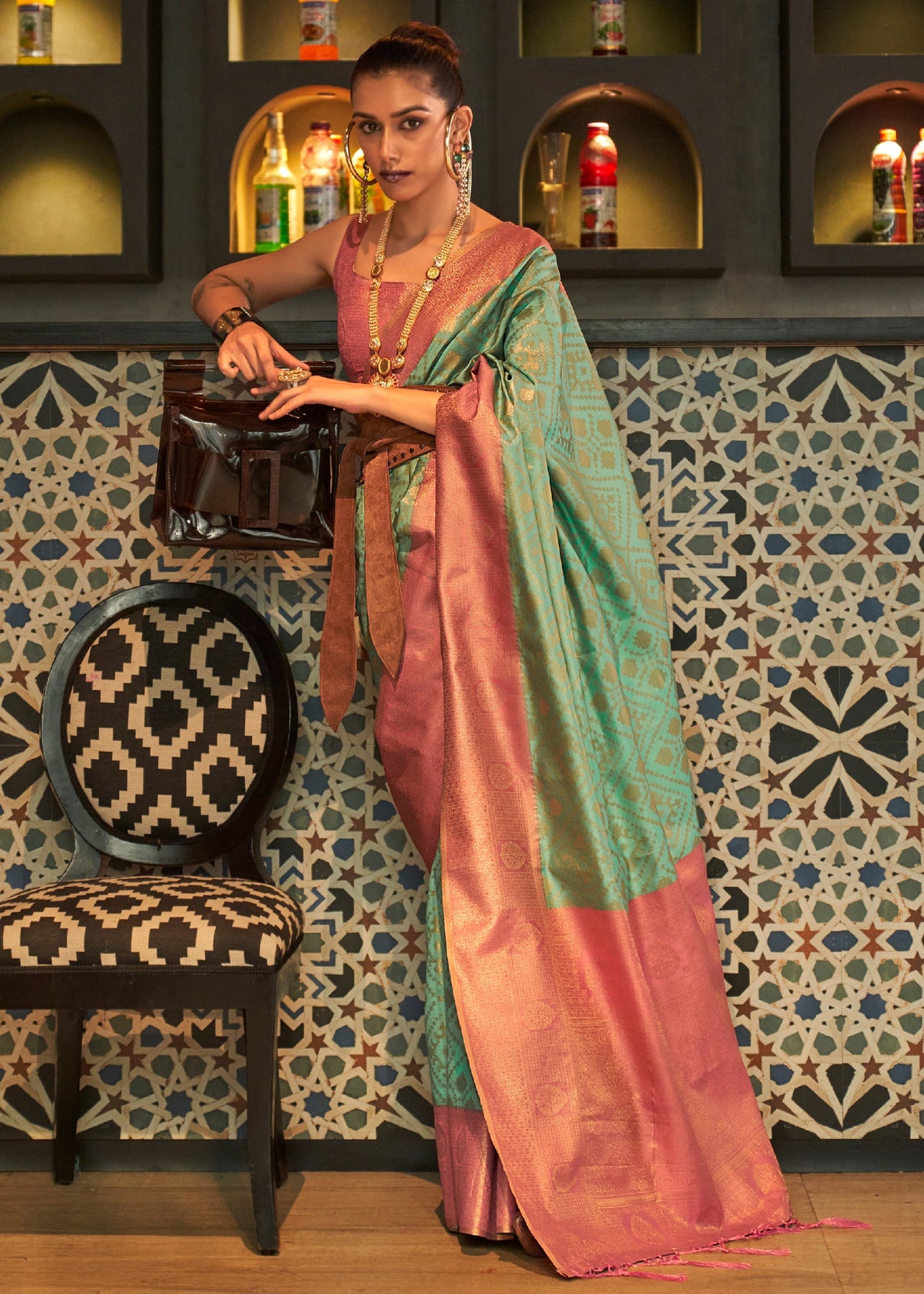 The Green and Flamingo Pink Silk Zari Base Chaap Handloom Weaving Saree is a stunning example of traditional Indian craftsmanship, blending vibrant colors with intricate weaving techniques to create a garment that is both elegant and timeless.