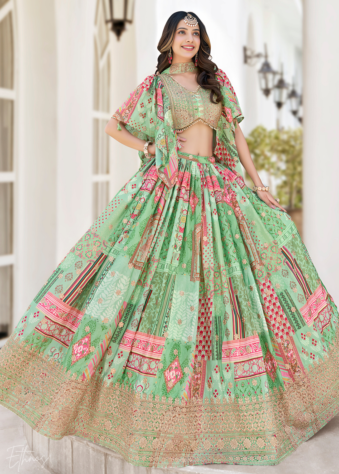 Discover artistry and vibrant elegance with this exquisite green multi-color patchwork lehenga. Crafted from a luxurious chinnon silk fabric, features intricate  prints and rich dori embroidery with sequence work. The modern silhouette and  blouse offer a contemporary twist to traditional festive wear, making it a head-turning choice for weddings, sangeets.
