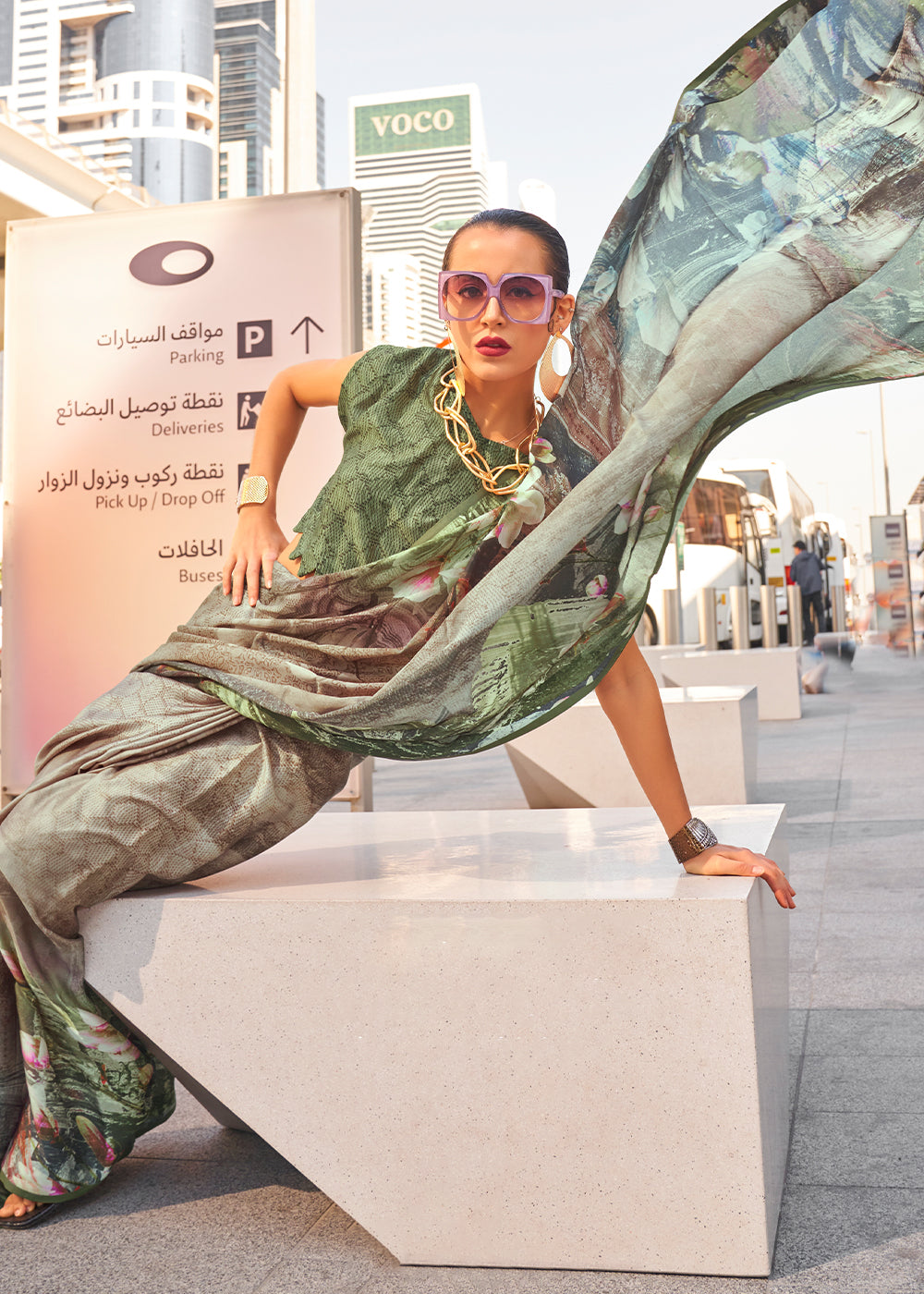 Greyish Green Digital Printed Satin Crepe Designer Saree