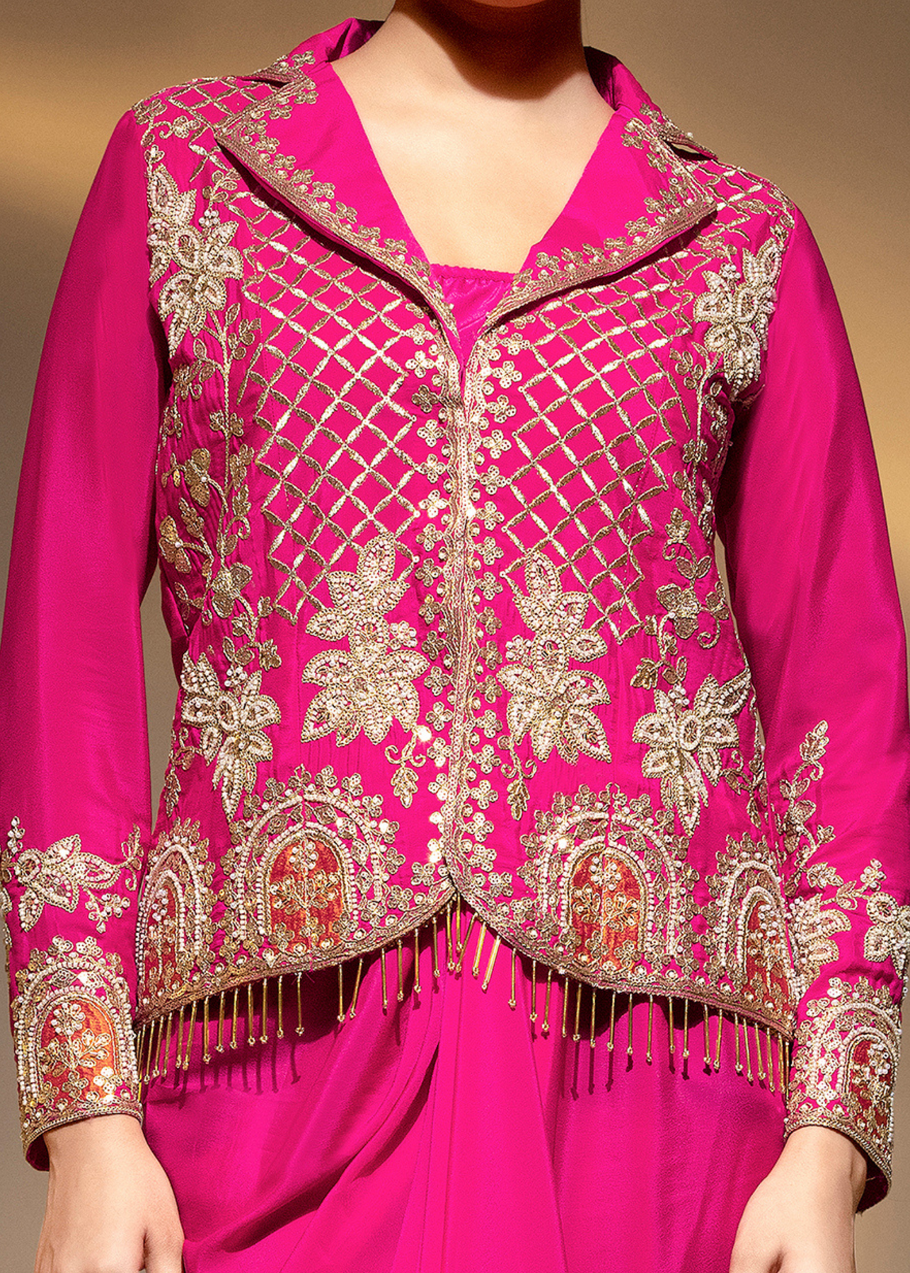 This indo-western hot pink jacket dhoti suit is meticulously adorned with intricate beadwork and traditional dabka dori embroidery. Crafted from premium crepe silk, the set is paired with a cowl-draped skirt for a seamless blend of comfort and high-fashion movement, making it a regal statement at weddings, sangeet ceremonies, or high-end festive parties.