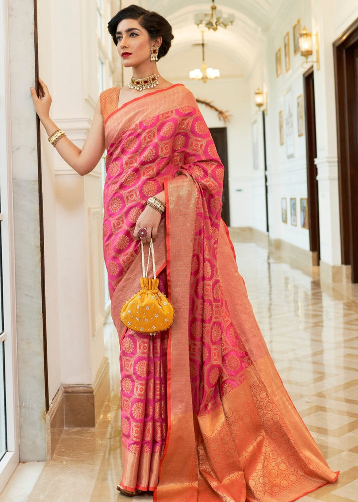 A traditional double Ikat weave from Gujarat, this beautiful Patola Saree is a perfect for festive season. Light weight ,woven with elegance comes with a contrast blouse that will enhance the beauty of this piece